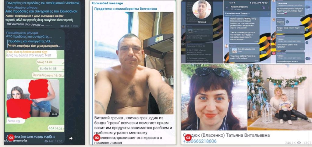 Ενδεικτικά στα κανάλια που εξερεύνησε το Documento εμφανίζονται εκατοντάδες άτομα και χιλιάδες επισυναπτόμενες φωτογραφίες από κάθε περίσταση, όπως μέσα κοινωνικής δικτύωσης, ιδιωτικές στιγμές και δημόσιες παρουσίες. Χαρακτηριστικό είναι το παράδειγμα της νεοναζιστικής παραστρατιωτικής οργάνωσης Δεξιός Τομέας, η οποία έχει δημιουργήσει ένα θεματικό κανάλι στο Telegram μόνο για τις περιπτώσεις των ρωσόφωνων «συνεργατών». Το εν λόγω κανάλι αφορά την πόλη Βολτσάνσκ, η οποία ανακαταλήφθηκε από τους Ουκρανούς στις αρχές Σεπτεμβρίου, μεσούσης της αντεπίθεσης που εξαπέλυσε το Κίεβο. Ο Δεξιός Τομέας υπήρξε μία από τις κινητήριες δυνάμεις του Μαϊντάν το 2014 και όταν ξεκίνησε ο εμφύλιος πόλεμος στις περιοχές των ρωσόφωνων είχε πλούσια εγκληματική δράση. Οι καταγγελίες συμπεριλάμβαναν βασανισμούς και δολοφονίες ρωσόφωνων που κατηγορούνταν για «προδοσία». Σε αυτό το μήκος κύματος κινούνται και οι καταγγελίες που πραγματοποιούν ρωσόφωνοι στο διαδίκτυο, οι οποίοι κάνουν λόγο για απειλές βιασμών ή θανάτου.