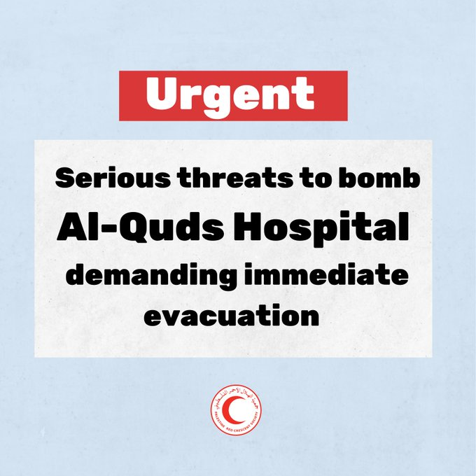 has just received serious threats from the occupation authorities to immediately #evacuate Al-Quds Hospital in the #Gaza Strip, as it is going to be #bombarded. Since this morning, there has been raids 50 meters away from the hospital Please share widely.
