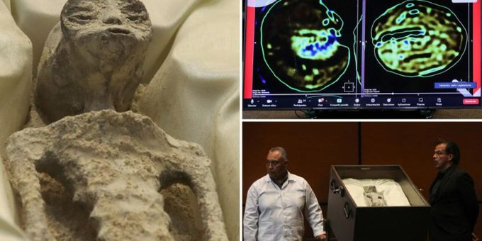 #Aliens Mexican officials show non-human corpses which they claim are aliens during their first UFO hearing today.#Mexico#MexicoUAPHearing – Recovered in Peru in a diatom mine – Found in 2017 between Palpa & Nazca – Carbon dated at approx 1000 years old pic.twitter.com/O5fhwcTI0w