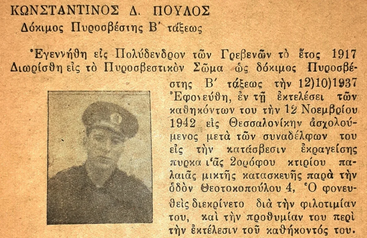 Στις 12 Νοεμβρίου 1942, στη Θεσσαλονίκη, ο δόκιμος πυροσβέστης Β’ τάξεως Κωνσταντίνος Πούλιος χάνει τη ζωή του κατά τη διάρκεια επιχείρησης κατάσβεσης πυρκαγιάς σε διώροφο οίκημα. Σε μια περίοδο όπου η χώρα ζει τα δεινά της Κατοχής, εκείνος υπηρετεί σε ένα σώμα που τότε βρισκόταν ακόμη σε διαδικασία συγκρότησης και οργάνωσης. Η απώλειά του καταγράφεται ως η πρώτη επίσημη θυσία πυροσβέστη εν ώρα καθήκοντος στη νεότερη ιστορία του Πυροσβεστικού Σώματος.