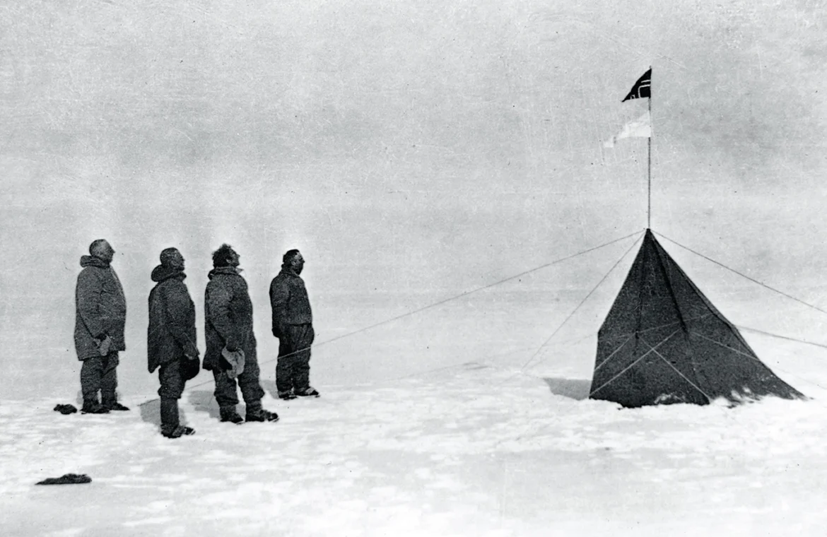 Στις 14 Δεκεμβρίου 1911, ο Ρόαλντ Άμουνδσεν και η ομάδα του γίνονται οι πρώτοι άνθρωποι που φτάνουν στον γεωγραφικό Νότιο Πόλο. Στήνουν μια μικρή σκηνή, υψώνουν τη νορβηγική σημαία και αφήνουν ένα γράμμα για τον βασιλιά Χάακον και ένα σημείωμα προς τον Σκοτ, σε περίπτωση που δεν επέστρεφαν ποτέ. Η καταγραφή της θέσης γίνεται με εμμονική ακρίβεια, ώστε να μη μείνει αμφισβήτηση — όπως είχε συμβεί στον Βόρειο Πόλο.