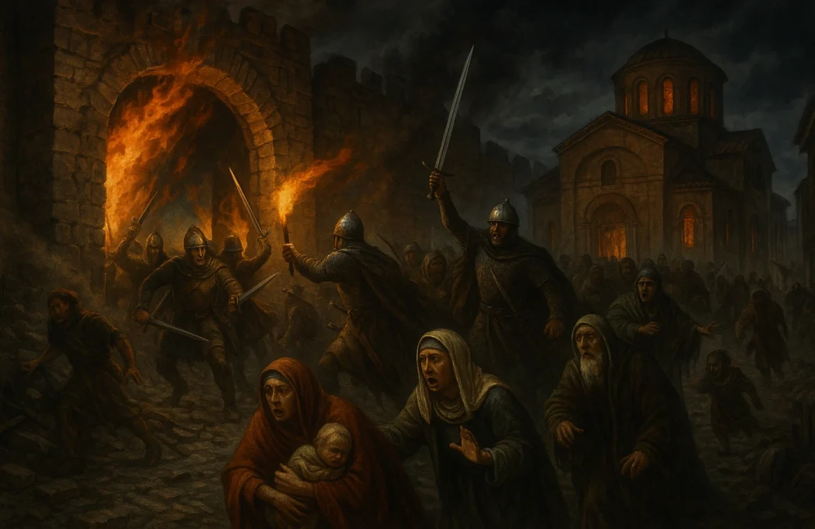 Η πόλη βίωσε μέρες ακραίου τρόμου: οι εκκλησίες βεβηλώθηκαν, ο ναός του Αγίου Δημητρίου μετατράπηκε σε στάβλο, χιλιάδες άνθρωποι αιχμαλωτίστηκαν, πουλήθηκαν ως δούλοι ή φονεύθηκαν στην τύχη. Η βιβλική αυτή καταστροφή περιγράφεται σαν αλάθητο σημάδι της οργής του Παντοδύναμου, όπως γράφει χαρακτηριστικά ο Άγγελος Βλάχος.