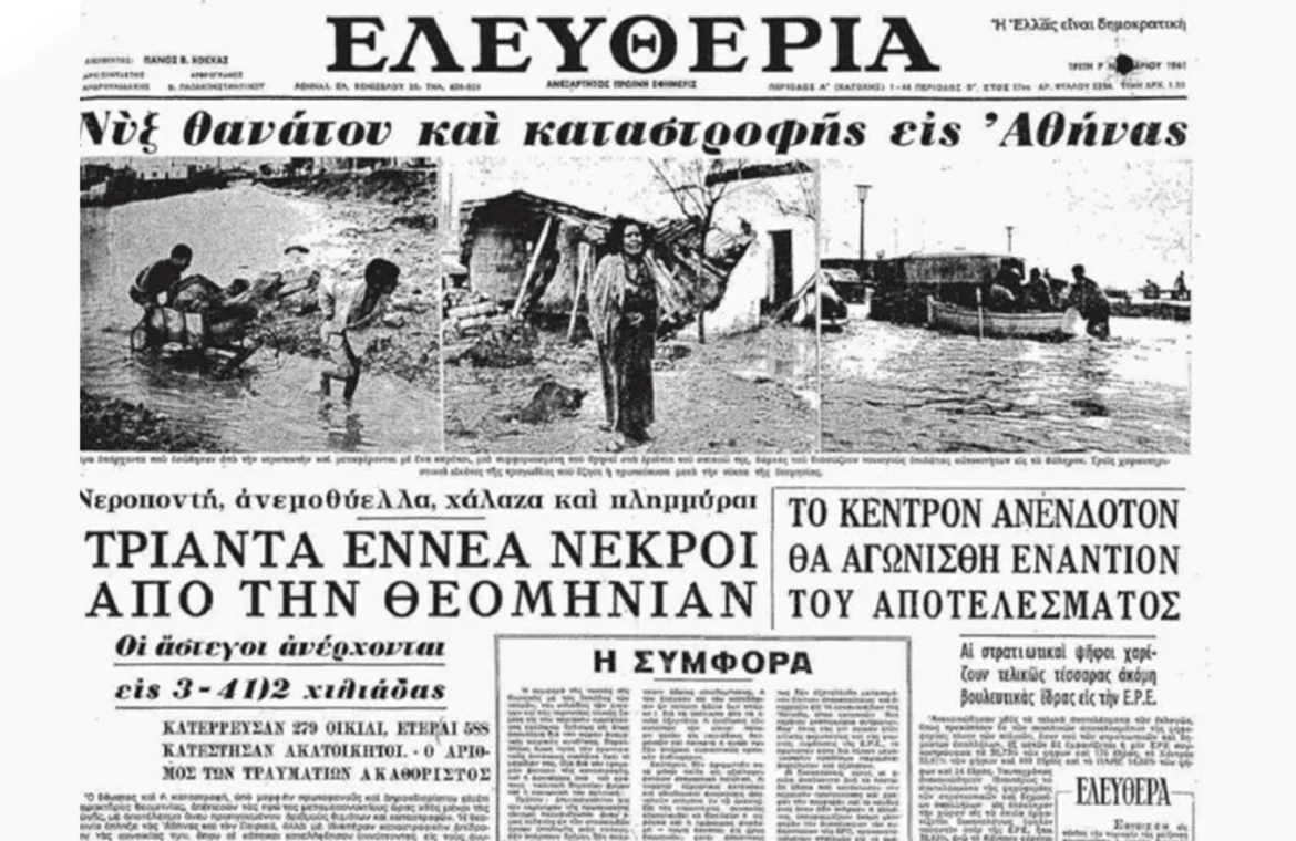 1961: Σφοδρή νεροποντή πλήττει την Αθήνα. Χάνουν τη ζωή τους 44 άνθρωποι, 300 τραυματίζονται και 3.700 μένουν άστεγοι. Ο Κηφισός ποταμός ξεχειλίζει, με αποτέλεσμα τα Λιόσια, το Περιστέρι, το Μπουρνάζι και το Μοσχάτο να γίνουν μία στάμπα λάσπης στον χάρτη της Αττικής.