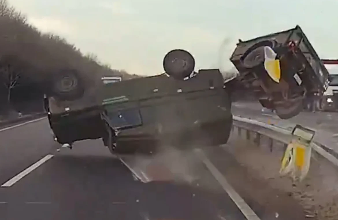 Ένα σοβαρό τροχαίο στη Βρετανία, το οποίο καταγράφηκε σε βίντεο και έχει διαδοθεί ευρέως στο διαδίκτυο, δείχνει στρατιωτικό όχημα να ανατρέπεται έπειτα από επικίνδυνο ελιγμό για την αποφυγή σύγκρουσης, σύμφωνα με δημοσίευμα της Sun.