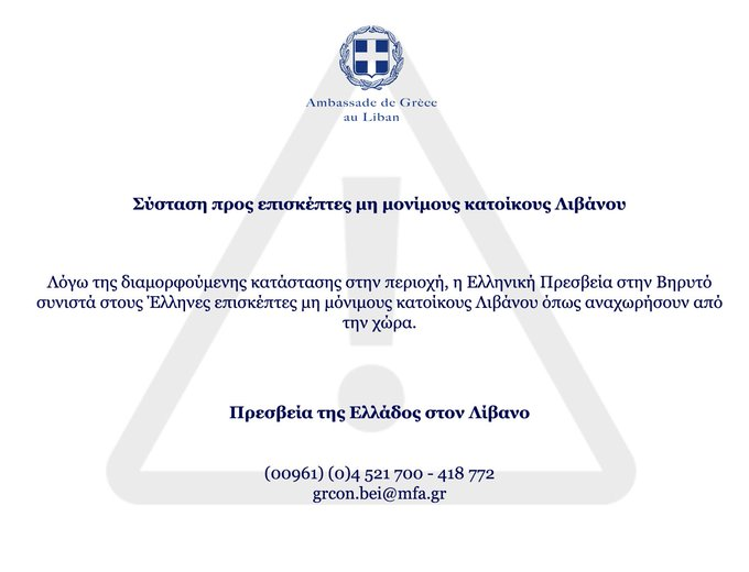 «Λόγω της διαμορφούμενης κατάστασης στην περιοχή, η Ελληνική Πρεσβεία στην Βηρυτό συνιστά στους Έλληνες επισκέπτες μη μόνιμους κατοίκους Λιβάνου όπως αναχωρήσουν από τη χώρα», αναφέρεται στην έκτακτη ανακοίνωση.