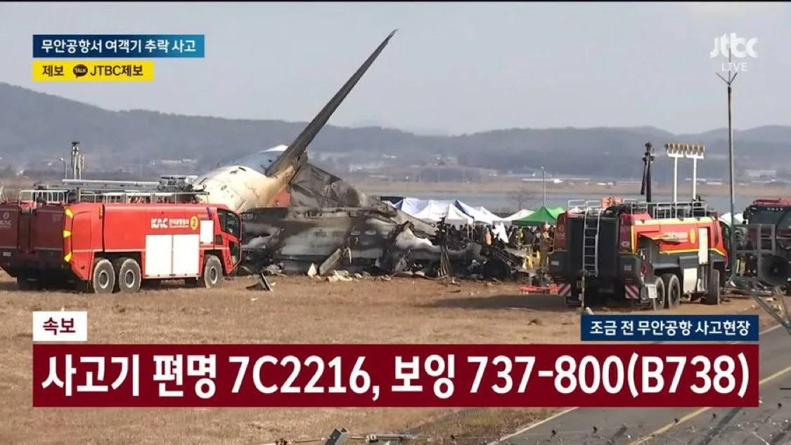 Οπτικό υλικό που μεταδόθηκε από νοτιοκορεατικά τηλεοπτικά δίκτυα εικονίζουν οχήματα των υπηρεσιών αντιμετώπισης εκτάκτων καταστάσεων γύρω από το απανθρακωμένο κουφάρι του αεροσκάφους.