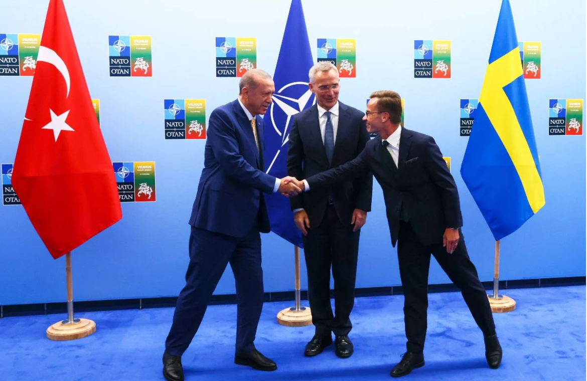 «Στις 10 Ιουλίου 2023, ο Πρόεδρος της Τουρκίας Ρετζέπ Ταγίπ Ερντογάν, ο Πρωθυπουργός της Σουηδίας Ουλφ Κρίστερσον και ο Γενικός Γραμματέας του ΝΑΤΟ Γενς Στόλτενμπεργκ συναντήθηκαν στη Σύνοδο Κορυφής του ΝΑΤΟ στο Βίλνιους.