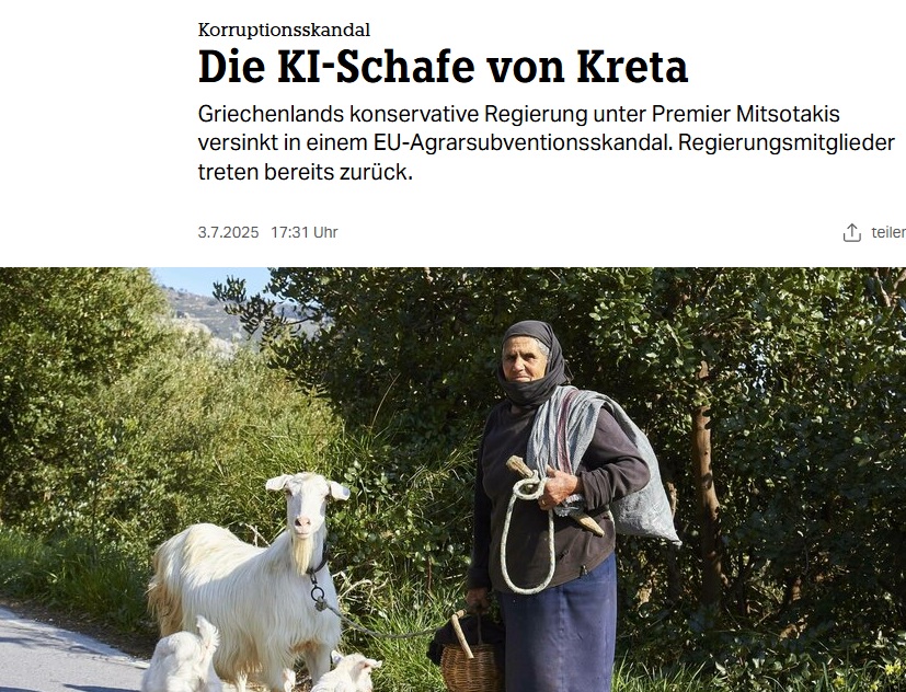 Με τον ειρωνικό τίτλο «Το AI (τεχνητή νοημοσύνη) πρόβατο της Κρήτης» η γερμανική εφημερίδα Die Tageszeitung, γνωστή ως ΤΑΖ, στην διαδικτυακή της έκδοση παρουσιάζει ένα μεγάλο ρεπορτάζ για το σκάνδαλο του ΟΠΕΚΕΠΕ το οποίο υπογράφει ο Φέρρυ Μπατζόγλου.