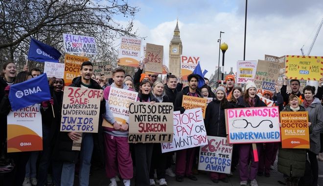 Χιλιάδες γιατροί άρχισαν σήμερα απεργία τριών ημερών στα βρετανικά νοσοκομεία ζητώντας μισθολογικές αυξήσεις, στο ξεκίνημα μιας εβδομάδας που αναμένεται ότι θα σηματοδοτηθεί από πολυάριθμες κοινωνικές κινητοποιήσεις.