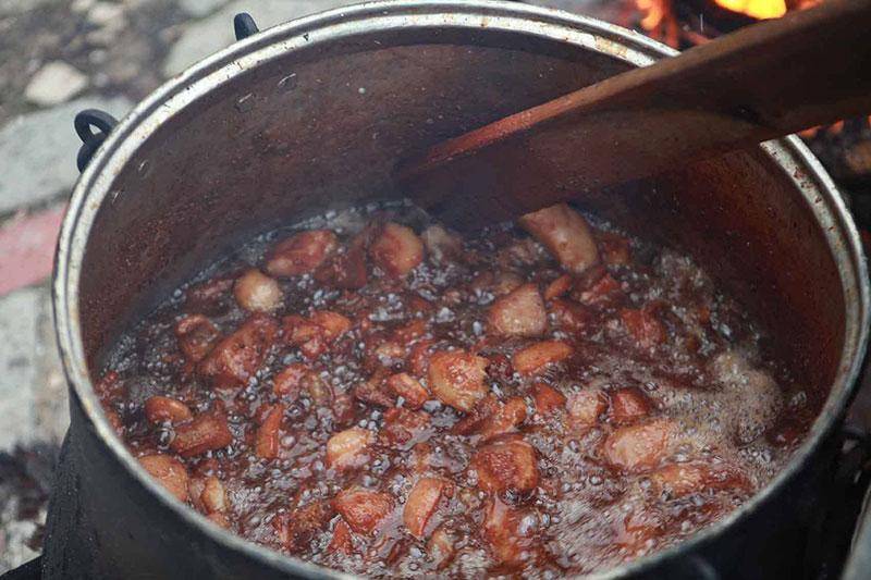Τα κομμάτια του κρέατος μετά τον τεμαχισμό μαγειρεύονταν, ενώ κάποια μέρη τα έφτιαχναν λουκάνικα. Το λίπος χρησιμοποιούνταν για μαγείρεμα, αφού το λάδι για τις φτωχές οικογένειες ήταν πανάκριβο. Μέχρι και σήμερα κατά την διάρκεια του εθίμου στη συνοικία της Φιλιππούπολης, οι γυναίκες μαγειρεύουν φαγητά της Ανατολικής Ρωμυλίας, και μαζί με το ψημένο χοιρινό κρέας και άφθονο κρασί τα προσφέρουν στους επισκέπτες.