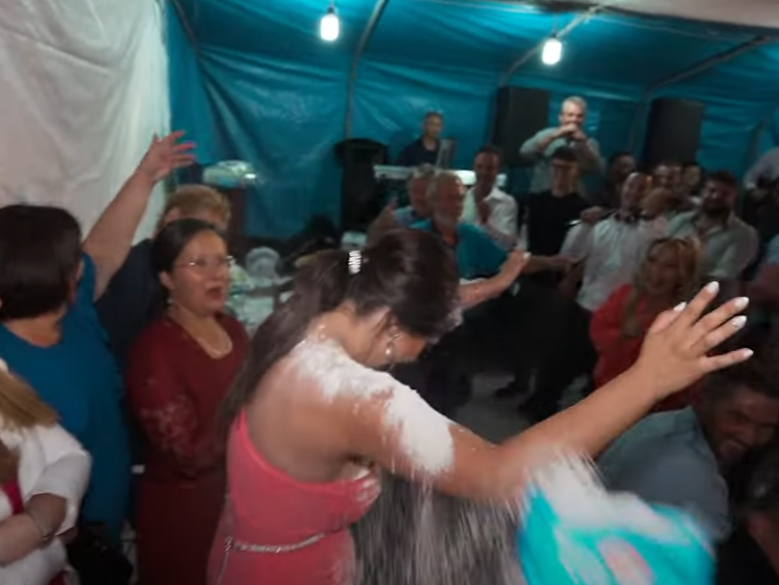 Έγινε δεκτή με… αλεύρι, που κατά την παράδοση συμβολίζει την ευχή όλων στους νιόπαντρους να ζήσουν, να γεράσουν και να ασπρίσουν μαζί. Τα δυο ερωτευμένα παιδιά συνέχισαν με χορούς και τραγούδια, ενώ ερωτευμένοι γαρ δεν μπορούσαν να αφήσουν ο ένας τον άλλο υποχρεώνοντας τον έτερο καλλιτέχνη, τον συνάδελφό τους τραγουδιστή να φωνάζει από μικροφώνου “εϊ, ξεκολλάτε”!…