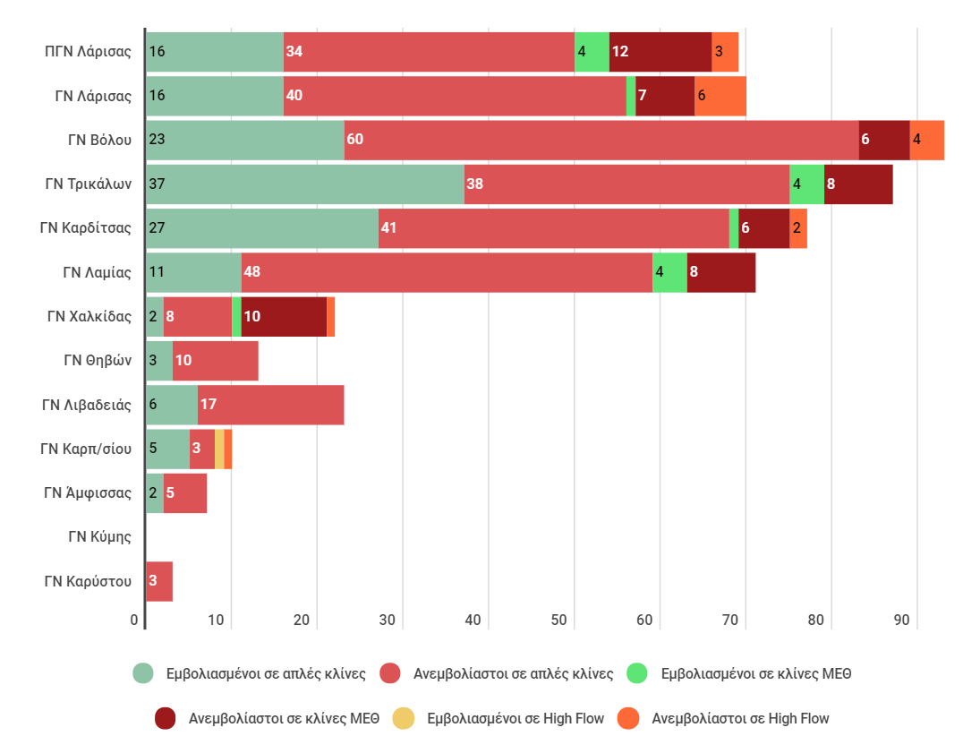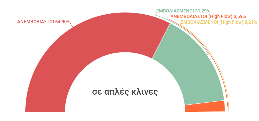 Τα στοιχεία που μας δίνει η 5η ΥΠΕ δείχνουν ότι στις απλές κλίνες το 64,90 % είναι ανεμβολίαστοι και το 31,29% εμβολιασμένοι. Την ίδια ώρα το 3,59% των ανεμβολίαστων ασθενών έχουν ανάγκη high flow, έναντι μόλις του 0,21% των ανεμβολίαστων.