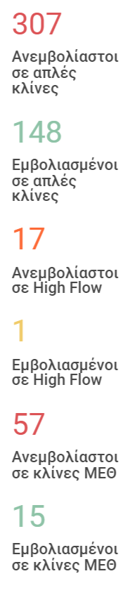 Σε απόλυτους αριθμούς έχουμε σε απλές κλίνες 307 ανεμβολίαστους και 148 εμβολιασμένους ασθενείς. Στις ΜΕΘ καταγράφουμε 57 ανεμβολίαστους και 15 εμβολιασμένους. Υποστήριξη με high flow χρειάστηκαν 17 ανεμβολίαστοι και μόλις ένας εμβολιασμένος.