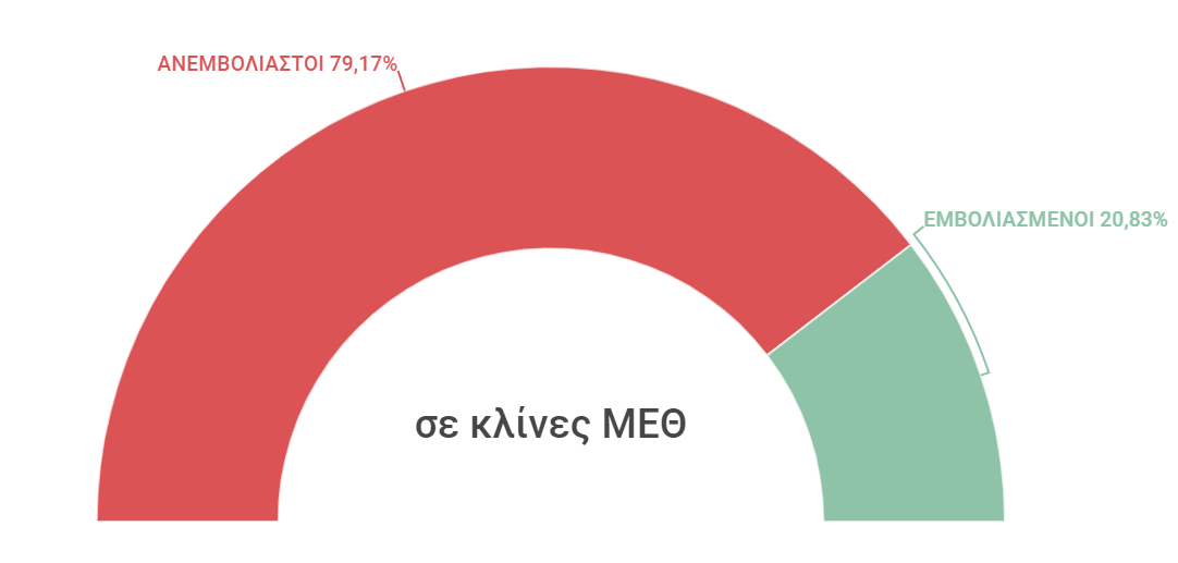 Στη ΜΕΘ όμως φαίνεται πως τα πράγματα είναι χειρότερα για τους ανεμβολίαστους καθώς το 79,17% των κλινών καλύπτεται από τέτοιους ασθενείς και μόλις το 20,83% από εμβολιασμένους.