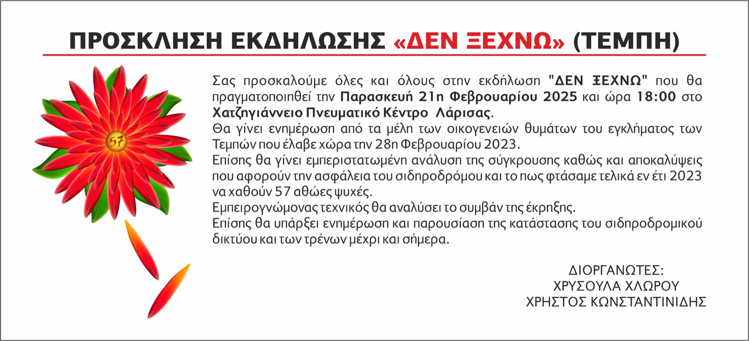 Εκδήλωση με τίτλο «Δεν Ξεχνώ» θα πραγματοποιηθεί την Παρασκευή 21η Φεβρουαρίου 2025 και ώρα 18:00 στο Χατζηγιάννειο Πνευματικό Κέντρο Λάρισας.