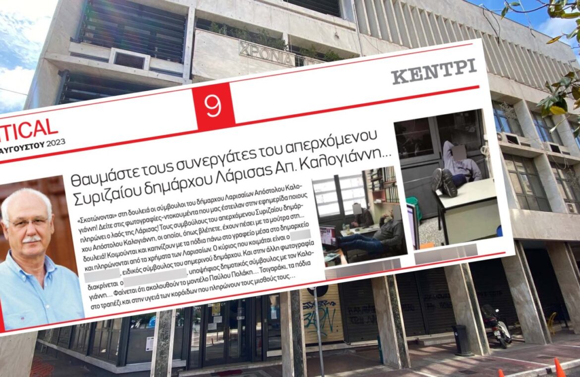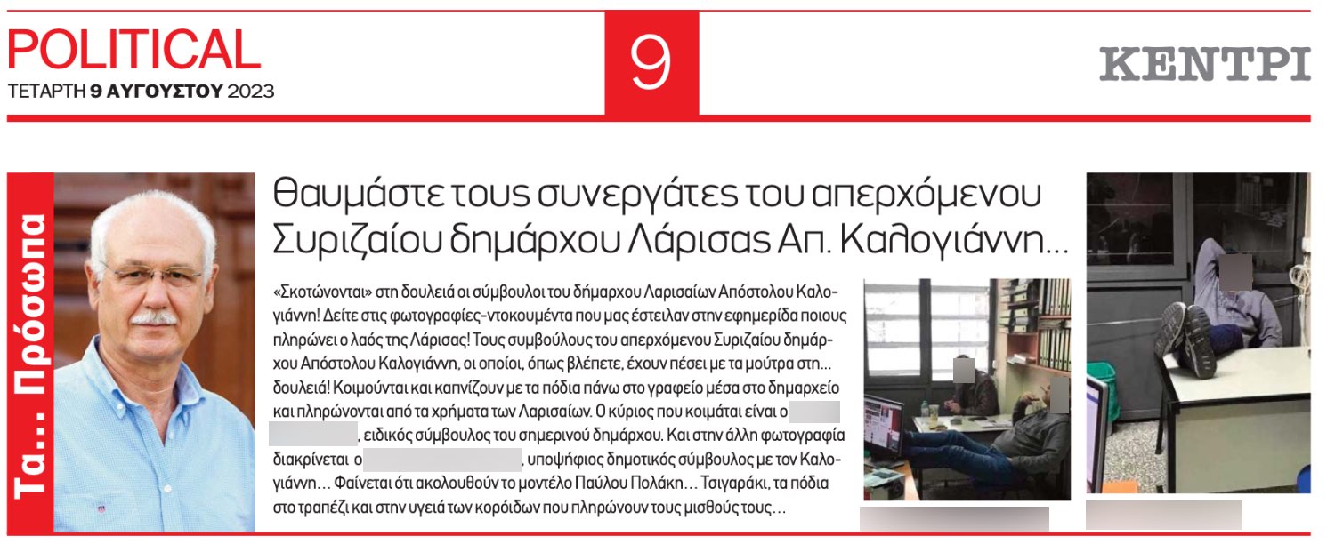 Οι φωτογραφίες διοχετεύτηκαν στην αθηναϊκή εφημερίδα «Political» η οποία και τις δημοσίευσε με το εξής κείμενο: «Σκοτώνονται» στη δουλειά οι σύμβουλοι του δήμαρχου Λαρισαίων Απόστολου Καλογιάννη! Δείτε στις φωτογραφίες-ντοκουμέντα που μας έστειλαν στην εφημερίδα ποιους πληρώνει ο λαός της Λάρισας! Τους συμβούλους του απερχόμενου Συριζαίου δημάρχου Απόστολου Καλογιάννη, οι οποίοι, όπως βλέπετε, έχουν πέσει με τα μούτρα στη… δουλειά! Κοιμούνται και καπνίζουν με τα πόδια πάνω στο γραφείο μέσα στο δημαρχείο και πληρώνονται από τα χρήματα των Λαρισαίων. Ο κύριος που κοιμάται είναι ο {…}, ειδικός σύμβουλος του σημερινού δημάρχου. Και στην άλλη φωτογραφία διακρίνεται ο {…}, υποψήφιος δημοτικός σύμβουλος με τον Καλογιάννη… Φαίνεται ότι ακολουθούν το μοντέλο Παύλου Πολάκη… Τσιγαράκι, τα πόδια στο τραπέζι και στην υγειά των κορόιδων που πληρώνουν τους μισθούς τους…»