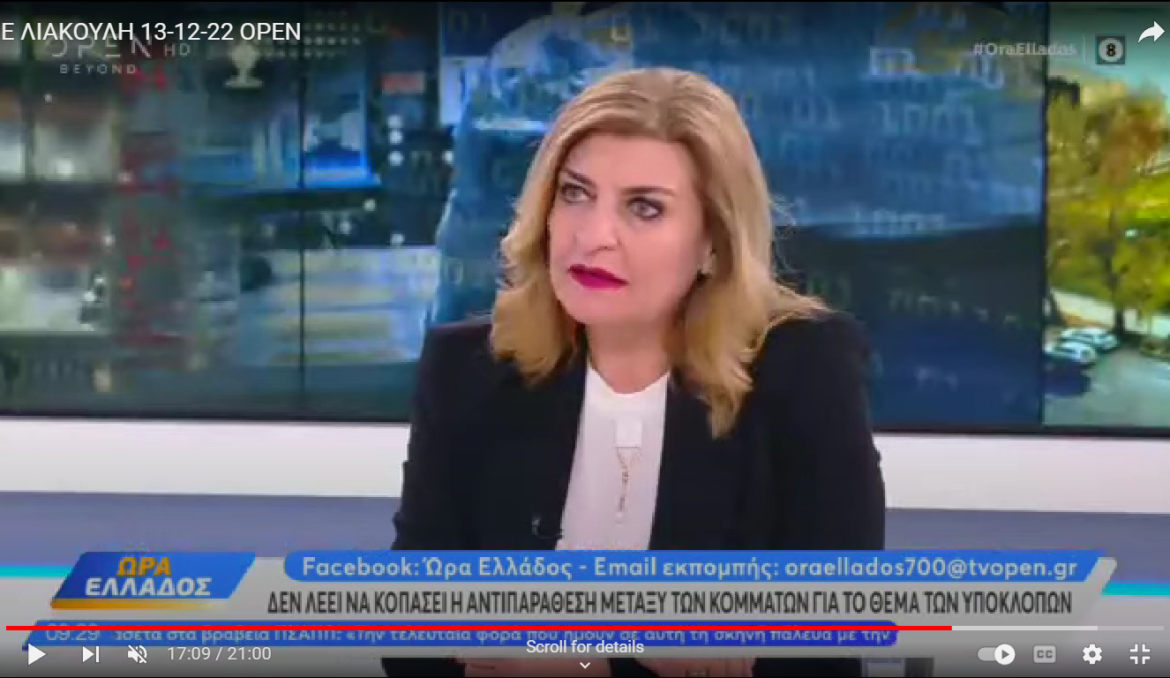 Στην εκπομπή «Ώρα Ελλάδος» του Open, με τουςδημοσιογράφους κ.κ. Δ. Καμπουράκη και Π. Στάθη, συμμετείχε η Γραμματέας της Κοινοβουλευτικής Ομάδας του ΠΑΣΟΚ – Κινήματος Αλλαγής και Βουλευτής Λάρισας, Ευαγγελία Λιακούλη.