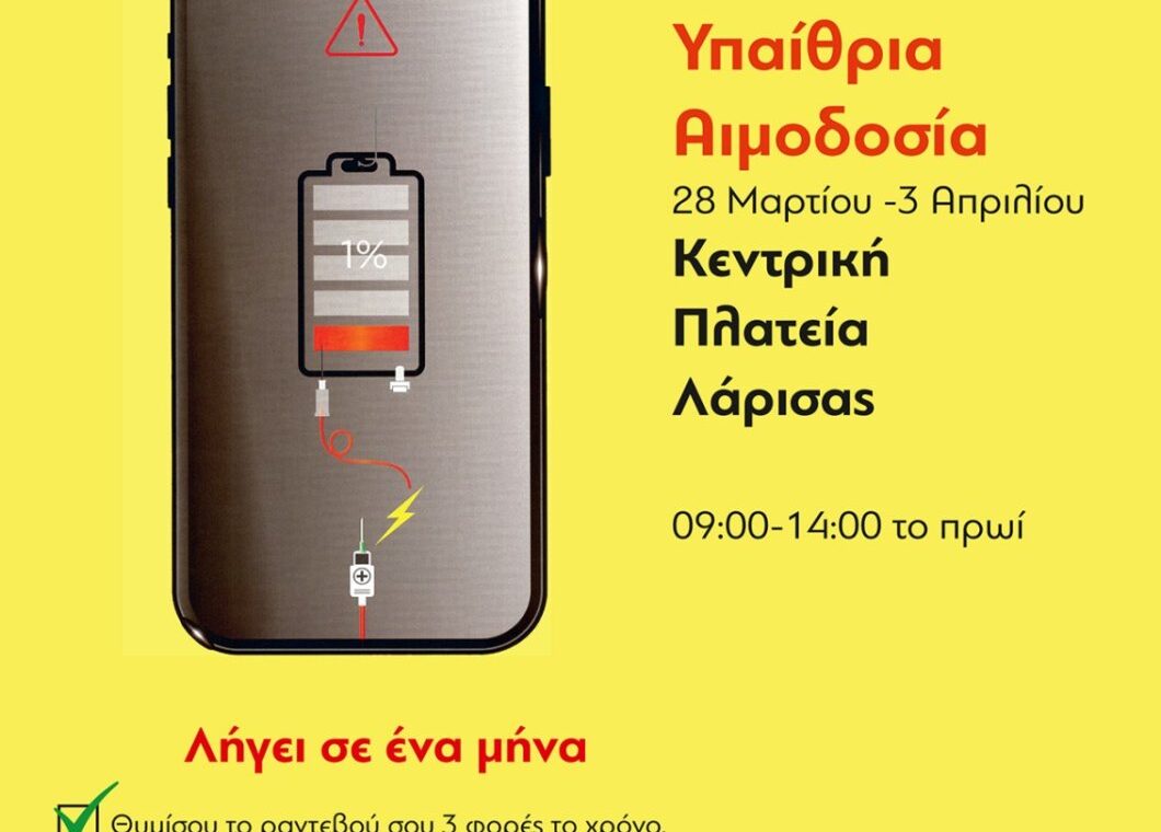 Θεσσαλία Εβδομαδιαία αιμοδοσία στην Κεντρική Πλατεία Λάρισας Μαρ 26, 2022 to kentri Twitter Facebook LinkedIn Pinterest Email Η Υπηρεσία Αιμοδοσίας του ΠΓΝΛ διοργανώνει υπαίθρια εβδομαδιαία αιμοδοσία στην Κεντρική Πλατεία Λάρισας κάθε μέρα από 28 Μαρτίου έως 3 Απριλίου και ώρες 9-2 το πρωί για να ενισχυθούν οι αυξημένες αιμοδοτικές ανάγκες. ❝ ετικέτες ❞ #ΑΙΜΟΔΟΣΙΑ #ΛΑΡΙΣΑ