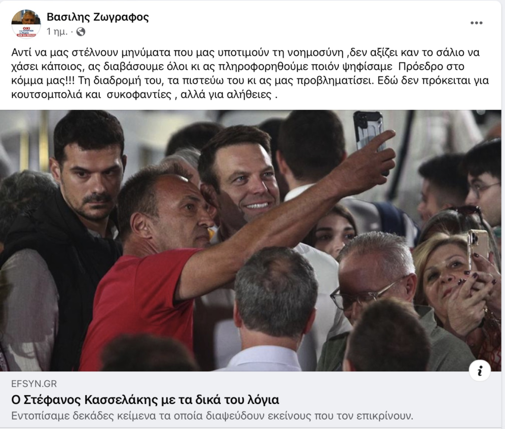 Έτσι, έγραψε ο κ. Ζωγράφος: “Αντί να μας στέλνουν μηνύματα που μας υποτιμούν τη νοημοσύνη ,δεν αξίζει καν το σάλιο να χάσει κάποιος, ας διαβάσουμε όλοι κι ας πληροφορηθούμε ποιόν ψηφίσαμε Πρόεδρο στο κόμμα μας!!! Τη διαδρομή του, τα πιστεύω του κι ας μας προβληματίσει. Εδώ δεν πρόκειται για κουτσομπολιά και συκοφαντίες , αλλά για αλήθειες”.