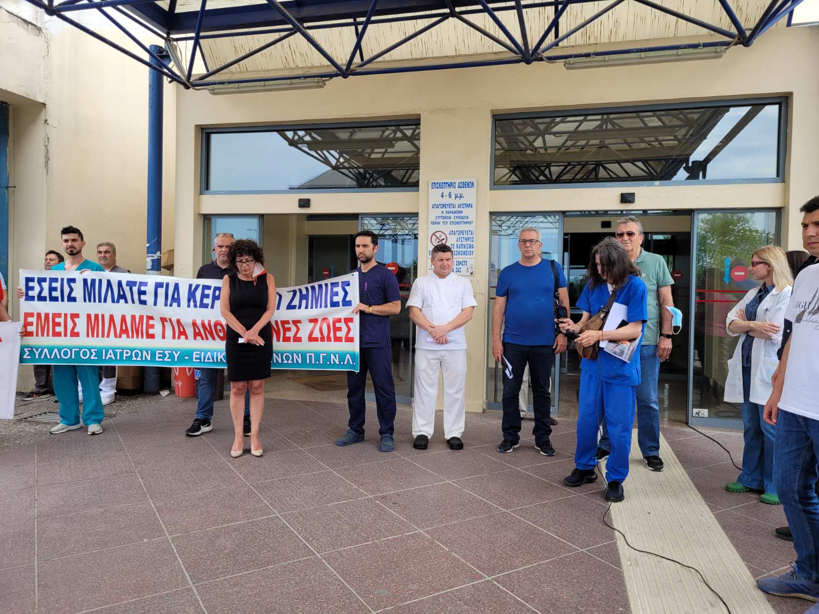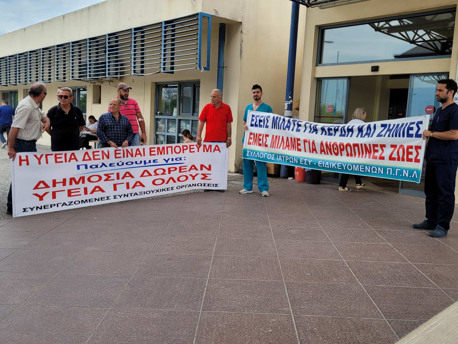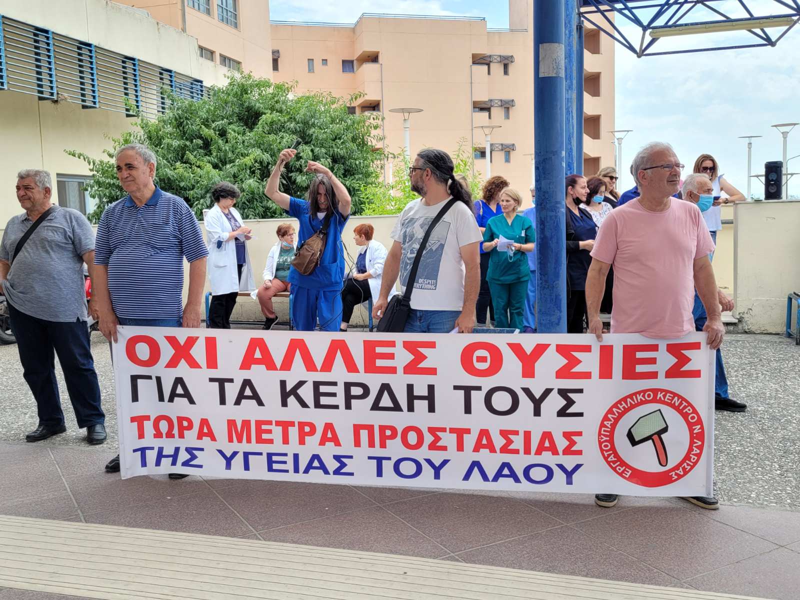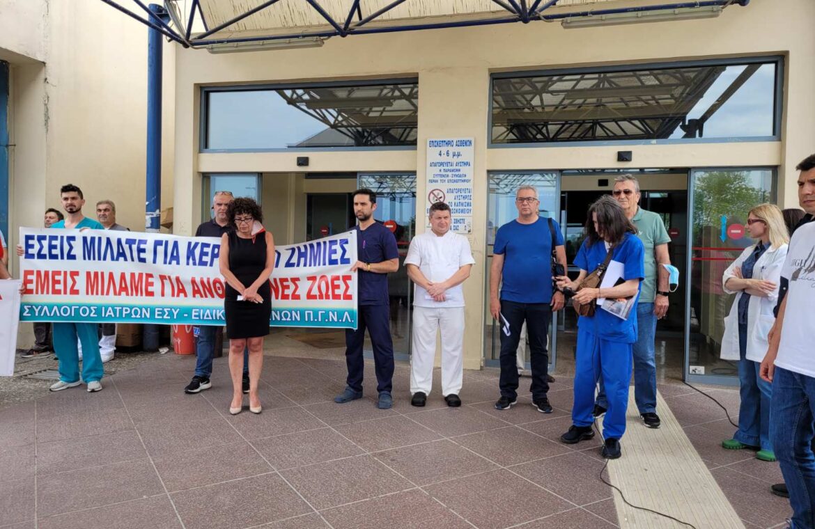 Πανό και συνθήματα σήμερα, το πρωί της Πέμπτης, από τον Σύλλογο Ιατρών ΕΣΥ – Ειδικευομένων ΠΓΝΛ και το Σωματείο Εργαζομένων ΠΓΝΛ, όπου διαμαρτυρήθηκαν στην Κεντρική Είσοδο του Πανεπιστημιακού Νοσοκομείου Λάρισας για το πρόσφατο εργατικό ατύχημα.