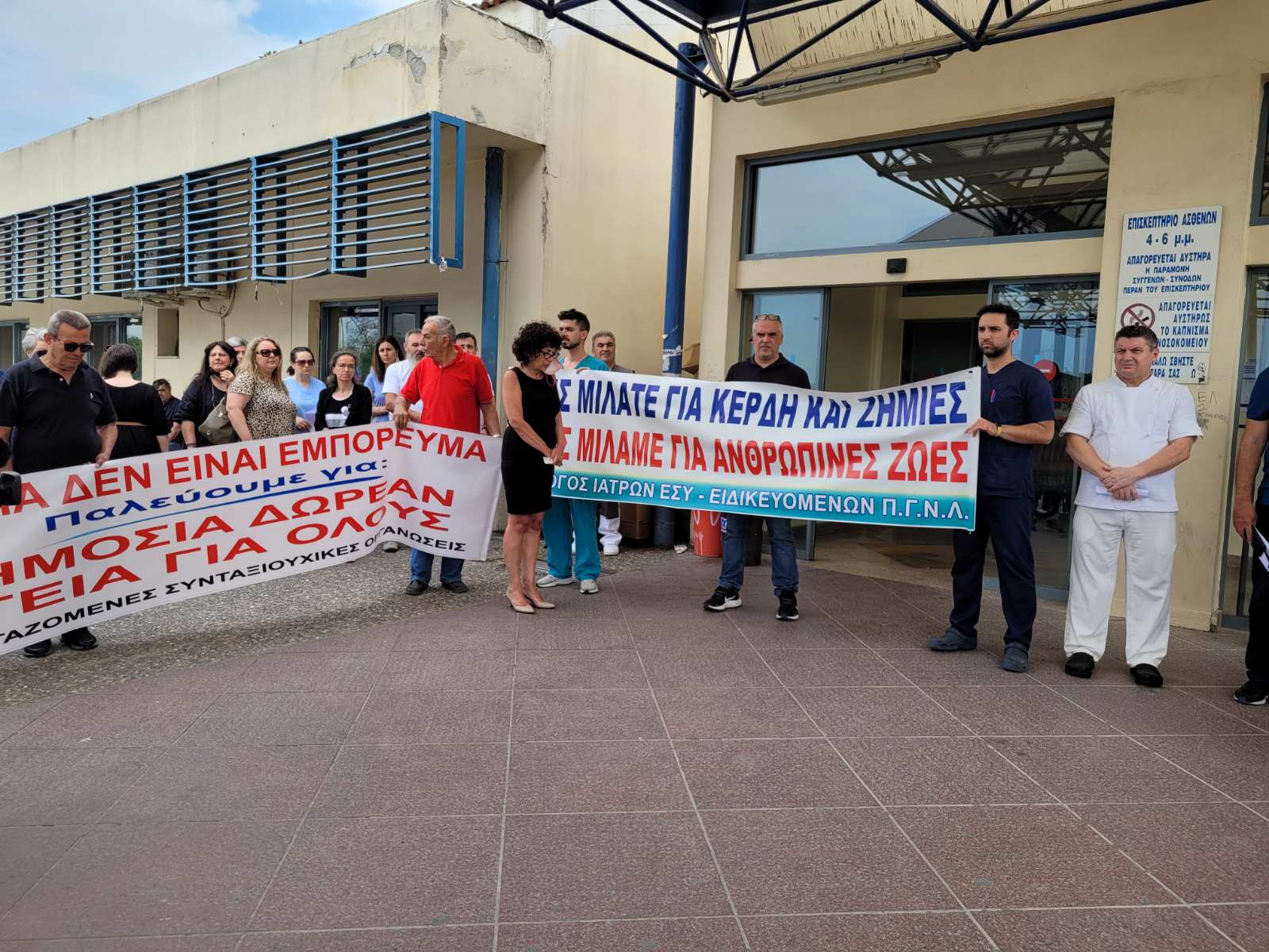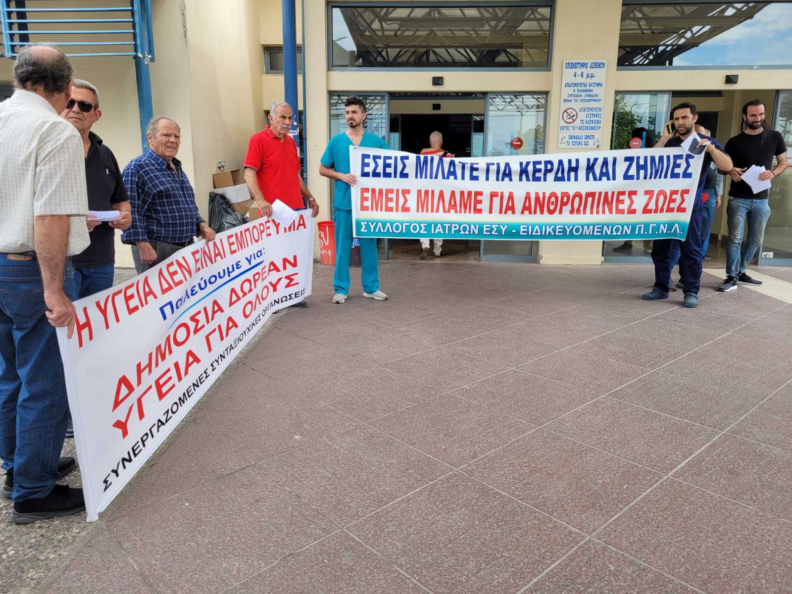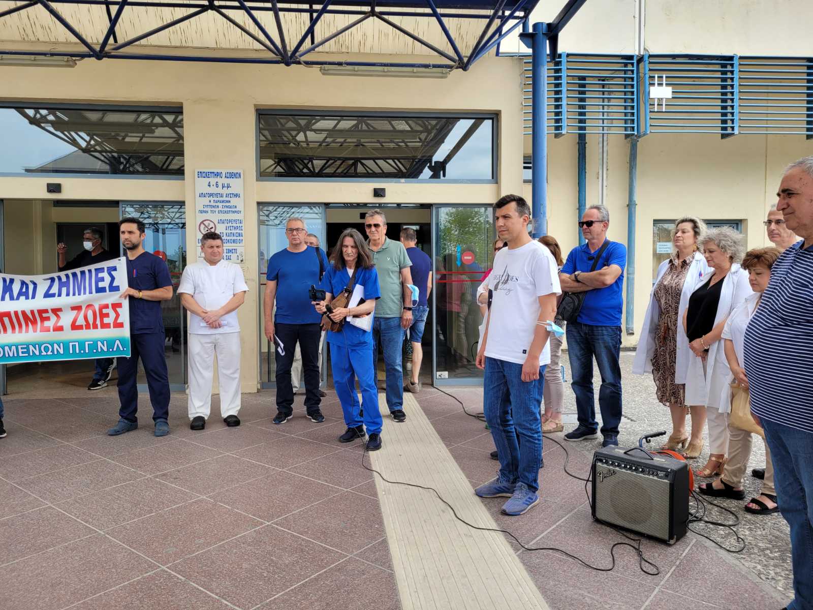 Πανό και συνθήματα σήμερα, το πρωί της Πέμπτης, από τον Σύλλογο Ιατρών ΕΣΥ – Ειδικευομένων ΠΓΝΛ και το Σωματείο Εργαζομένων ΠΓΝΛ, όπου διαμαρτυρήθηκαν στην Κεντρική Είσοδο του Πανεπιστημιακού Νοσοκομείου Λάρισας για το πρόσφατο εργατικό ατύχημα.