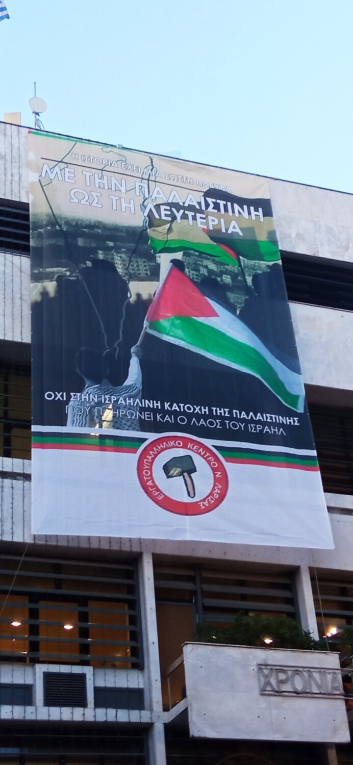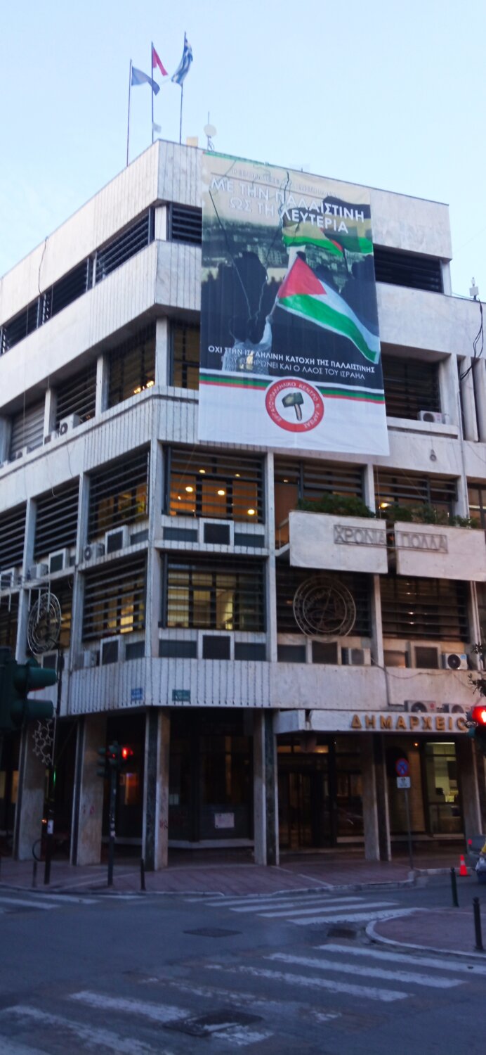 Νωρίς το πρωί της Τετάρτης αναρτήθηκε γιγαντιπανό του Εργατικού Κέντρου Λάρισας για την Παλαιστίνη στην πρόσοψη του Δημαρχείου της Λάρισας με σύνθημα «ΜΕ ΤΗΝ ΠΑΛΑΙΣΤΊΝΗ ΩΣ ΤΗΝ ΛΕΥΤΕΡΙΑ- ΟΧΙ ΣΤΗΝ ΙΣΡΑΗΛΙΝΗ ΚΑΤΟΧΗ ΤΗΣ ΠΑΛΑΙΣΤΙΝΗΣ ΠΟΥ ΠΛΗΡΩΝΕΙ ΚΙ Ο ΛΑΟΣ ΤΟΥ ΙΣΡΑΗΛ!!!».