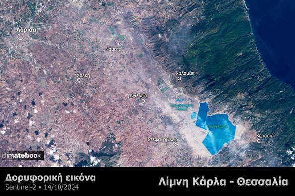 Στις παρακάτω δορυφορικές εικόνες που επεξεργάστηκε η επιστημονική ομάδα του Climatebook παρουσιάζεται σε υψηλή ανάλυση η κατάσταση στη λίμνη Κάρλα πέρυσι ένα μήνα μετά την έλευση της κακοκαιρίας Daniel (στις 10 Οκτωβρίου 2023), και φέτος ένα χρόνο μετά (στις 14 Οκτωβρίου 2024).