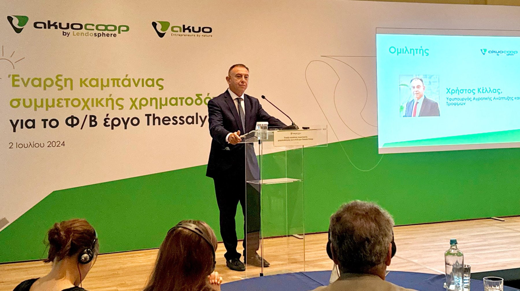 Την σημασία της πράσινης ανάπτυξης για την ενεργειακή επάρκεια του θεσσαλικού αγροτικού κόσμου, επεσήμανε ο Υφυπουργός Αγροτικής Ανάπτυξης και Τροφίμων Χρήστος Κέλλας, στην εκδήλωση για την έναρξη της καμπάνιας συμμετοχικής χρηματοδότησης (crowdfunding) των φωτοβολταϊκών έργων της Akuo Greece στην Θεσσαλία.