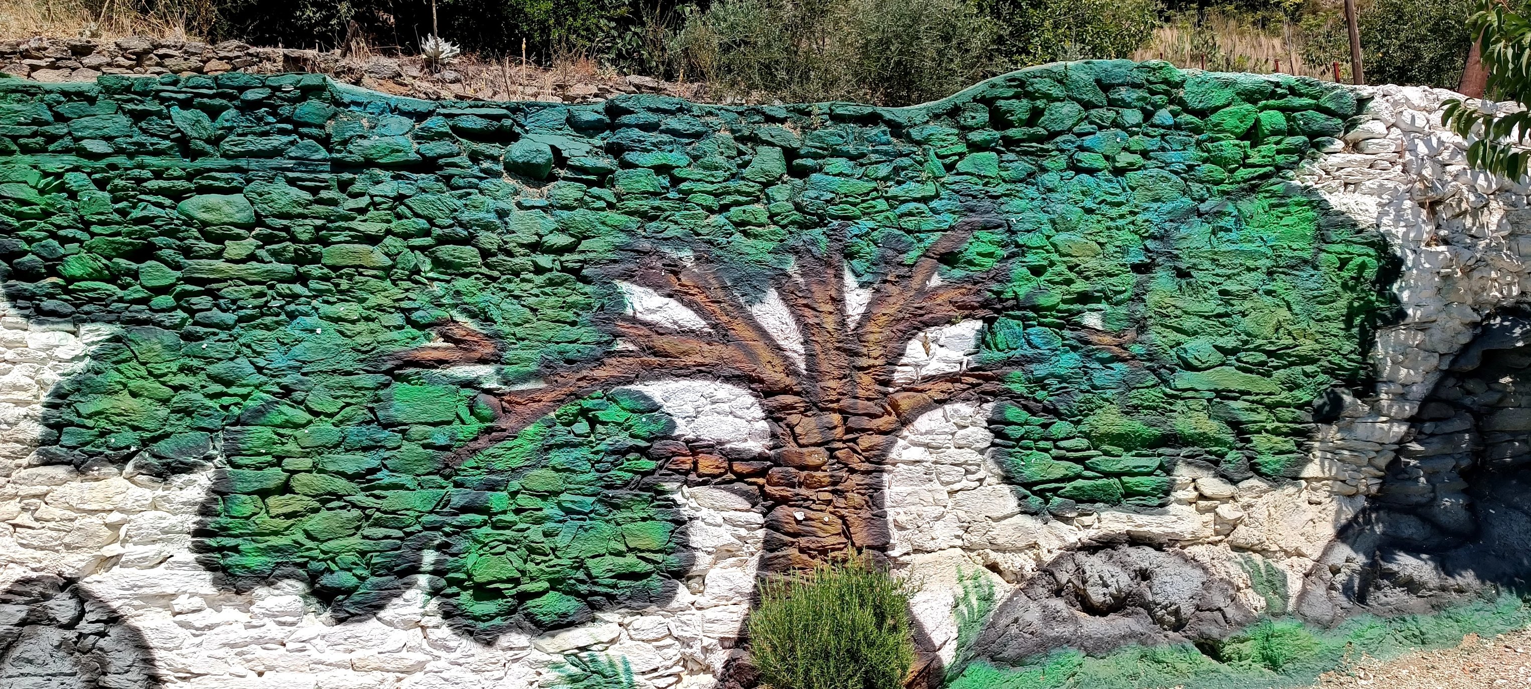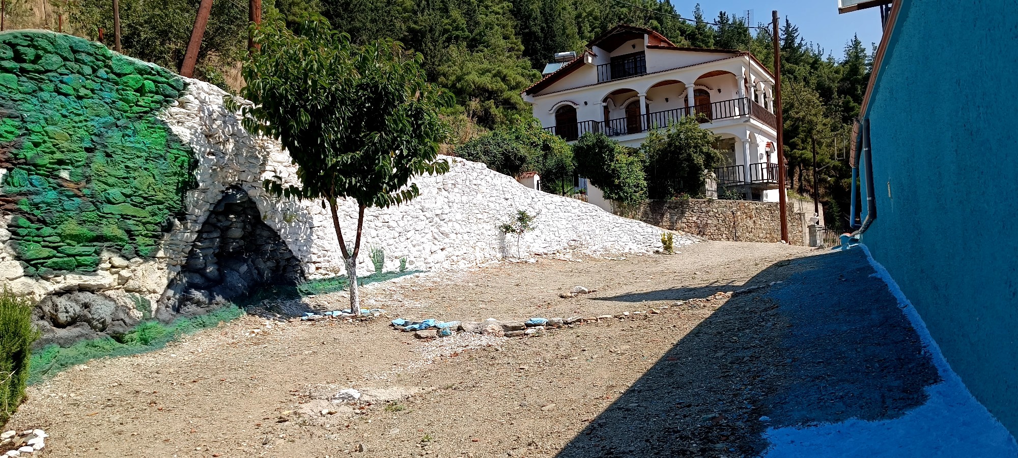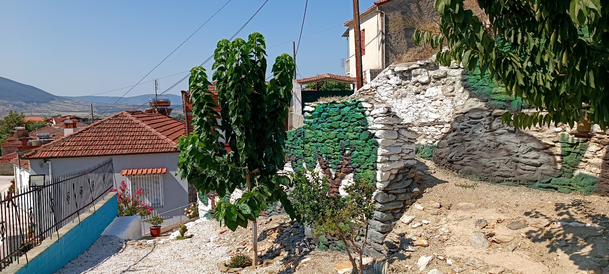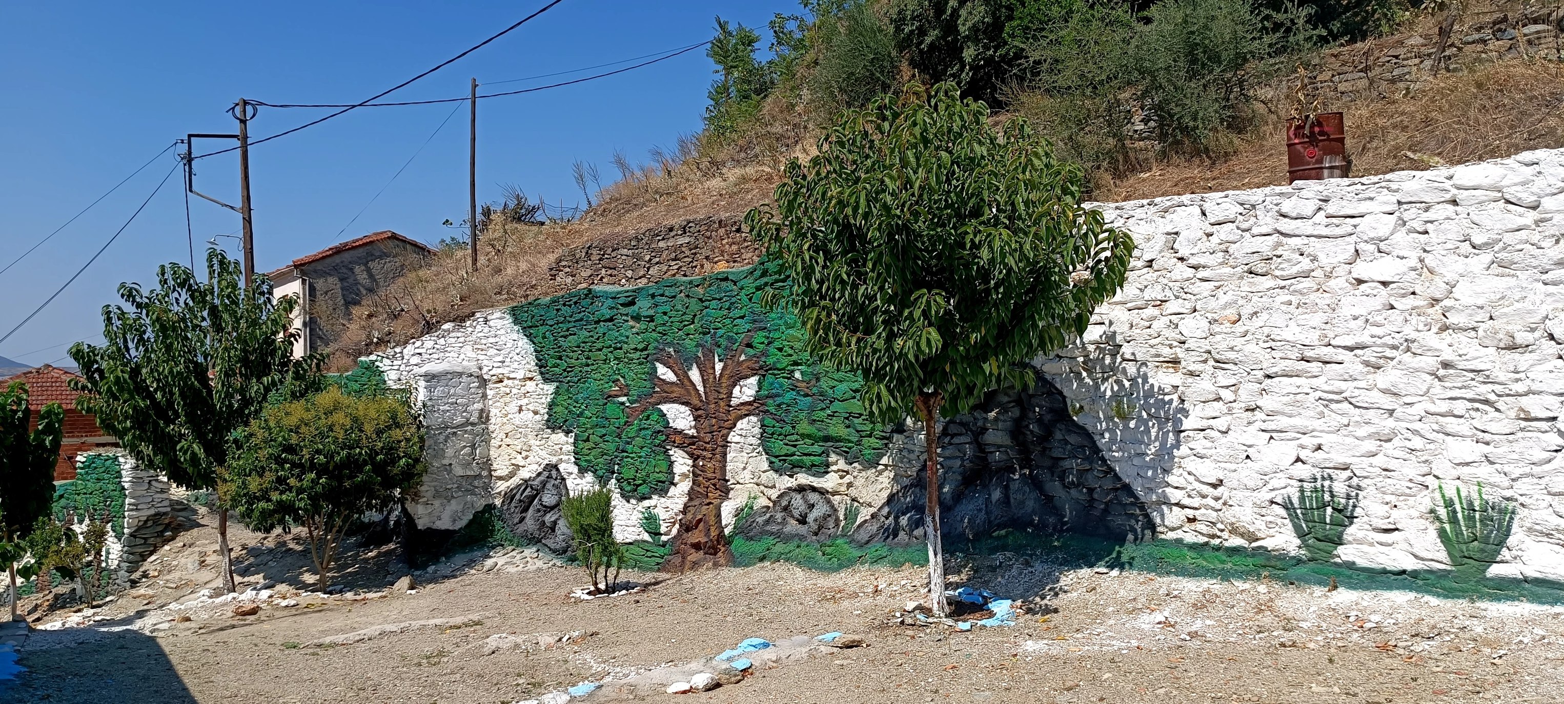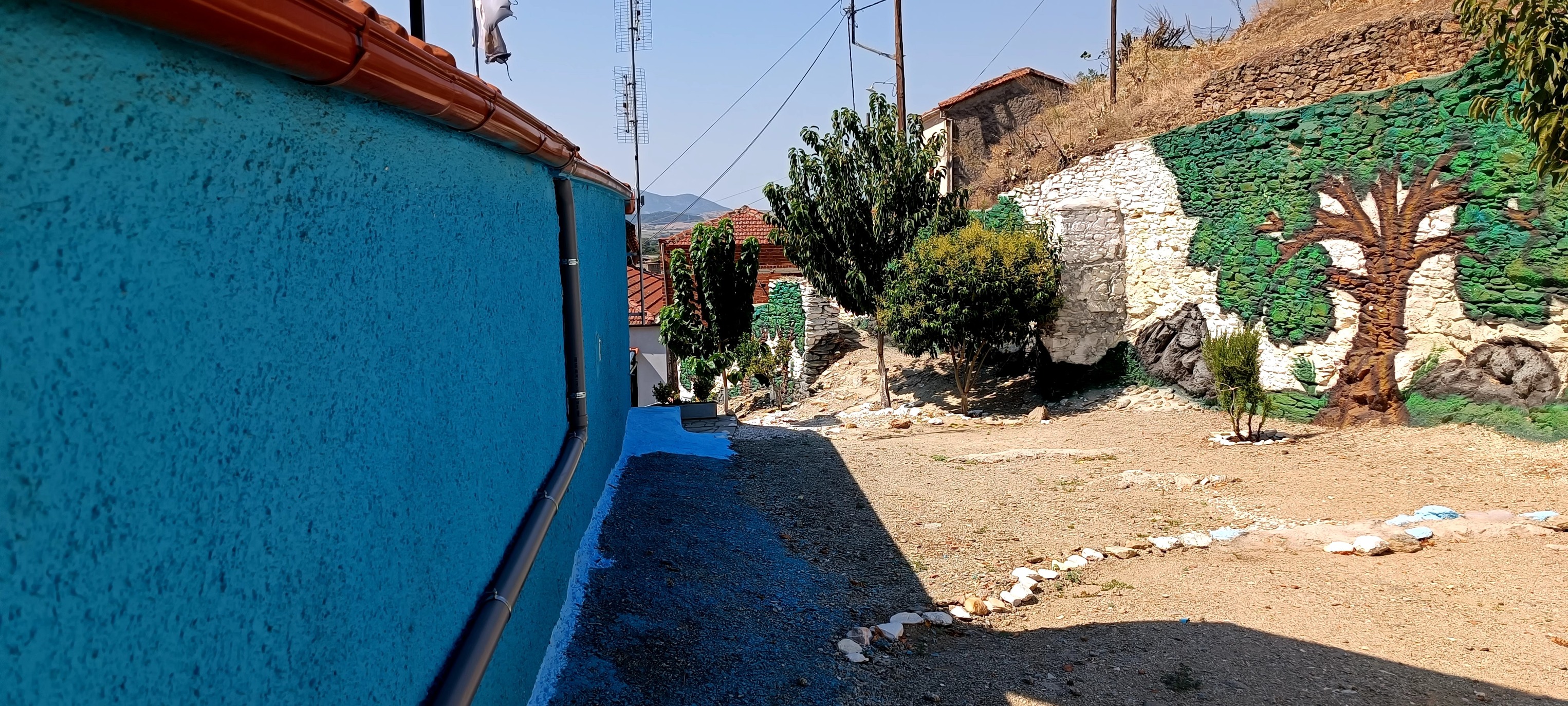 Πρόσθεσε από τη βορειοδυτική πλευρά στον ελεύθερο χώρο την πινελιά του και μαζί με φίλο του έκανε και δημιούργησε ένα όμορφο χώρο με μπόλικη φαντασία με μεράκι και έδωσε ένα προφίλ που αναδεικνύει το περιβάλλον του τόπου του. Ζωγράφισε δένδρα στους τοίχους και φύτεψε δένδρα στο χώμα, που έφερε για να μπορεί να καλλιεργήσει ότι θέλει στο μέλλον…