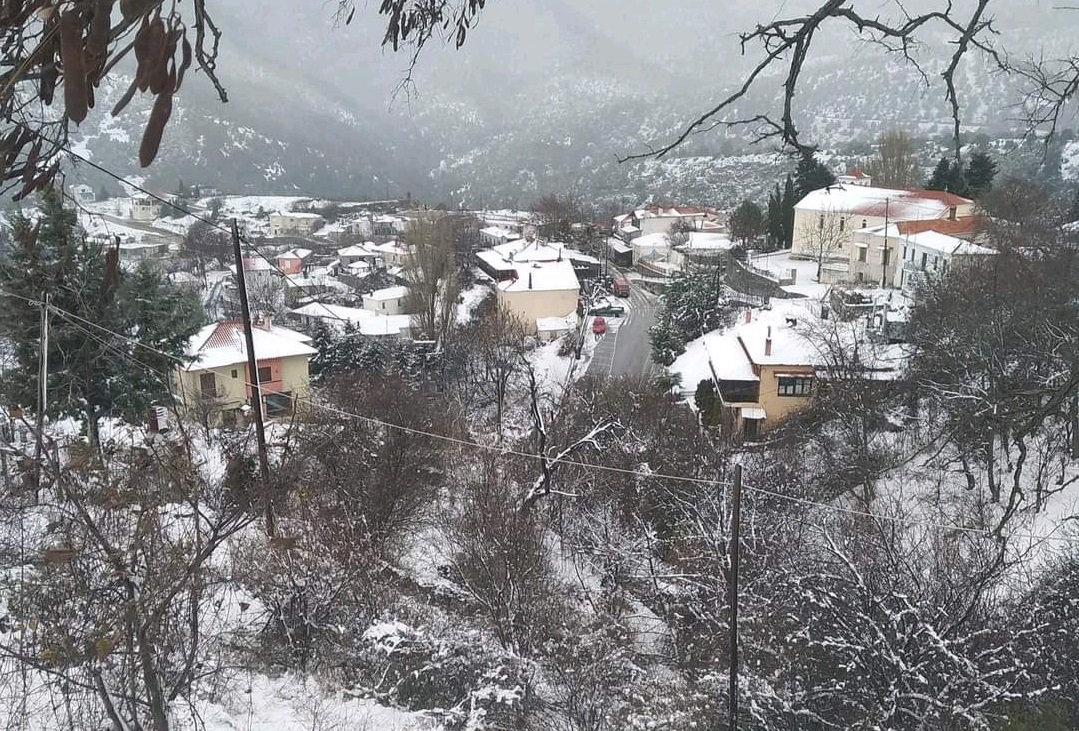 Στα λευκά από προχθές και η Σπηλιά Κισσάβου, στον Νομό Λάρισας. Το χιόνι είναι στους 5 πόντους μέσα στο χωριό, λίγο περισσότερο πιο ψηλά στο Καταφύγιο.