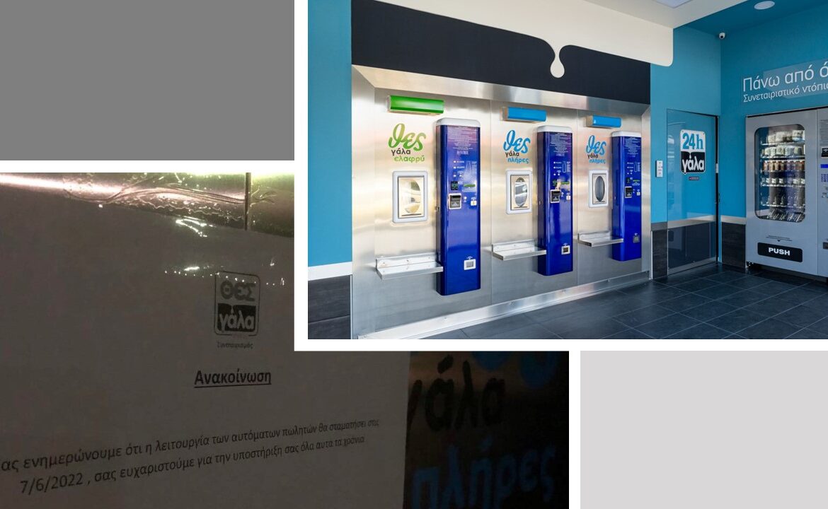 Οι αυτόματοι πωλητές γάλακτος της ΘΕΣγάλα που είχαν ξεκινήσει από τη Λάρισα πριν από χρόνια, προκαλώντας μεγάλο ενθουσιασμό στο καταναλωτικό κοινό όλης της Ελλάδας σταματούν τη λειτουργία τους. Ήδη μάλιστα έχουν τοποθετηθεί σχετικές ανακοινώσεις με τις οποίες ενημερώνεται το κοινό. Ωστόσο τα προϊόντα της εταιρείας ΘΕΣγάλα με την ποιότητα που τους διακρίνει συνεχίζουν να πωλούνται κανονικά σε καταστήματα και σούπερ μάρκετ.