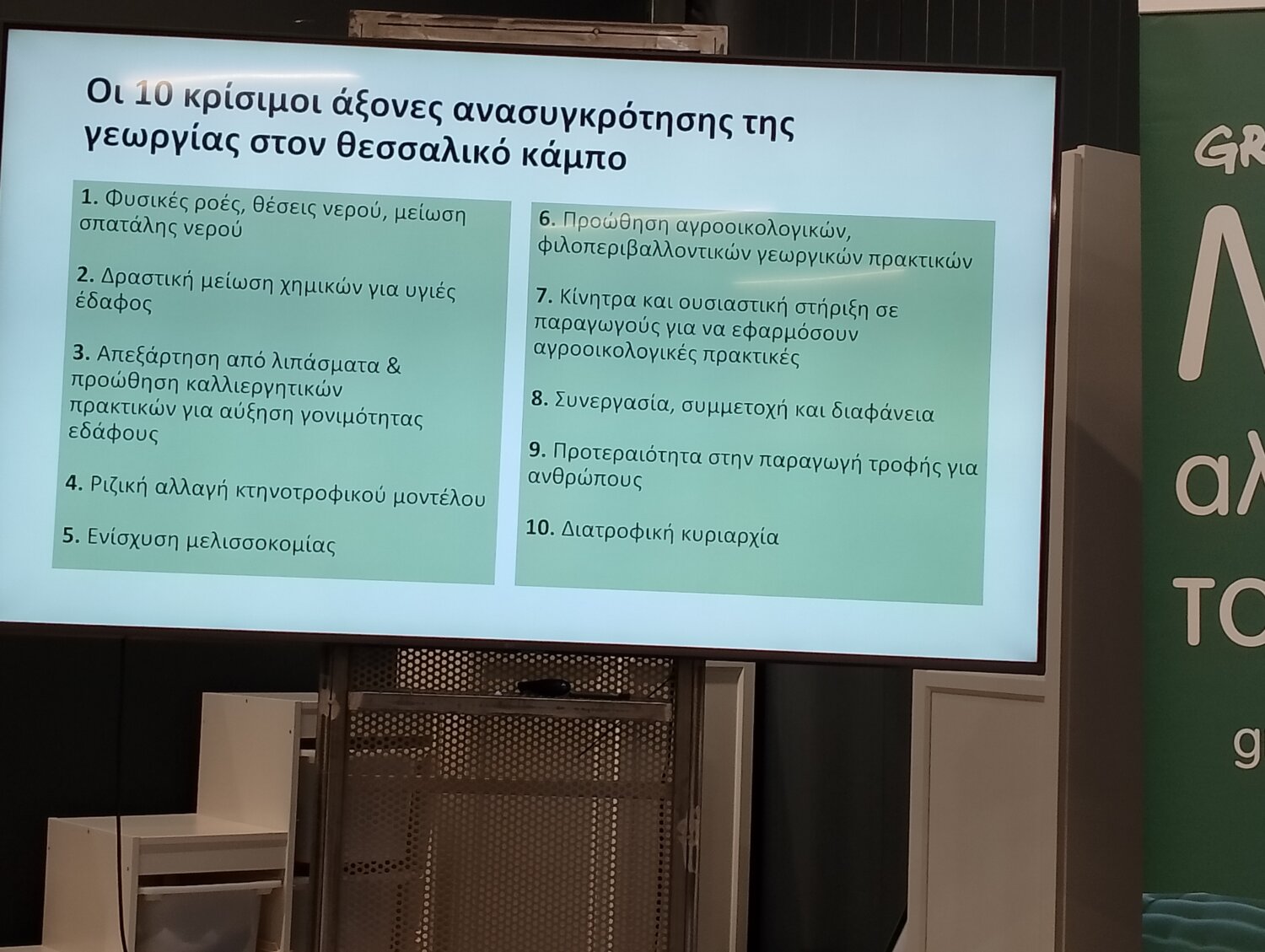 Στη συνέχεια αναλύθηκαν οι δέκα κρίσιμοι άξονες ανασυγκρότησης της γεωργίας στον Θεσσαλικό κάμπο όπως η σωστή διαχείριση των υδατικών πόρων, η δραστική μείωση χημικών, η απεξάρτηση απο λιπάσματα, η ριζική αλλαγή του κτηνοτροφικού μοντέλου, η ενίσχυση της μελισσοκομίας. η προώθηση αγροοικολογικών, η στήριξη σε παραγωγούς, η συνεργασία, η προτεραιτότηα στην παραγωγή διατροφής και η διατροφική κυριαρχία.