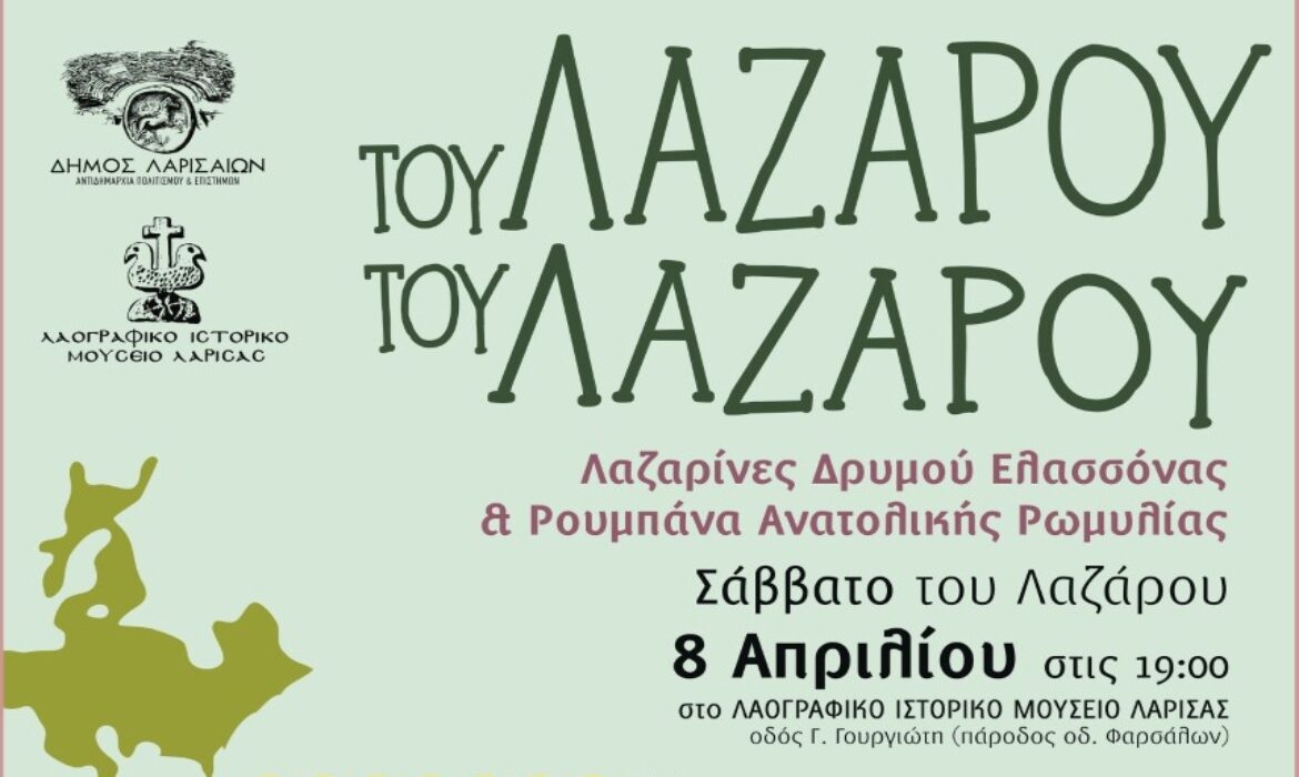 Η Αντιδημαρχία Πολιτισμού και Επιστημών του Δήμου Λαρισαίων και το Λαογραφικό Ιστορικό Μουσείο Λάρισας σε συνεργασία με την Εξωραϊστική Μορφωτική Λέσχη Φιλιππούπολης και τον Πολιτιστικό Σύλλογο Δρυμού Ελασσόνας, διοργανώνουν την αναβίωση των εθίμων «Λαζαρίνες Δρυμού Ελασσόνας & Ρουμπάνα Ανατολικής Ρωμυλίας» που θα πραγματοποιηθεί το Σάββατο του Λαζάρου 8 Απριλίου στις 19:00 στο Λαογραφικό Ιστορικό Μουσείο Λάρισας.