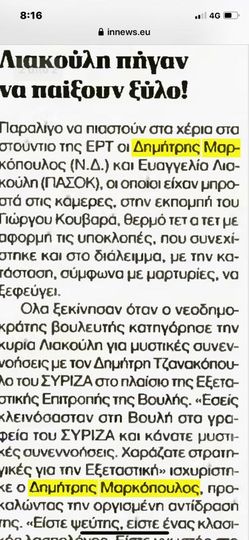 Επίπεδο ελληνικής δημοσιογραφίας: «Στην πρώτη σελίδα η εφημερίδα Δημοκρατία «αποκαλύπτει» πως δήθεν «πιάστηκα στα χέρια με γυναίκα βουλευτή». Δηλαδή υπονοεί πως τη χτύπησα, προφανώς για να δημιουργήσει εντυπώσεις και να σχηματιστεί εις βάρος μου εικόνα σεξιστικής και βίαιης σωματικής επίθεσης που φυσικά ποτέ δεν υπήρξε. Στις μέσα σελίδες γράφει «παρολίγον να πιαστούν στα χέρια»!!!! Στον τίτλο βεβαιώνει δηλαδή επίθεση κι εντός του ρεπορτάζ λέει άλλα.
