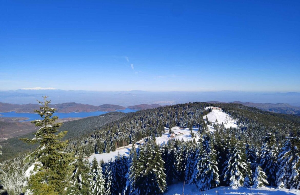 Ο αέρας άγριος, το τοπίο λευκό και στο βάθος η Λίμνη Πλαστήρα με το πράσινο να κυριαρχεί σε χαμηλότερα υψόμετρα.