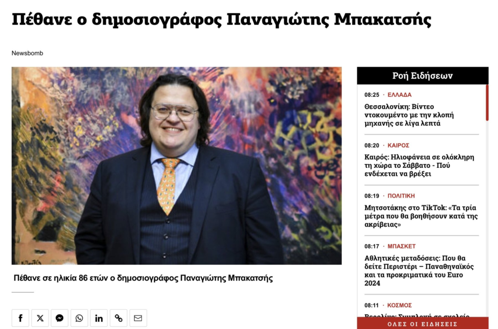 Όπως διαπίστωσε, σε δημοφιλή ενημερωτική ιστοσελίδα των Αθηνών, στην είδηση με τίτλο «Πέθανε ο δημοσιογράφος Παναγιώτης Μπακατσής», είχε τοποθετηθεί η φωτογραφία του ιδίου, να ποζάρει… χαμογελαστός!