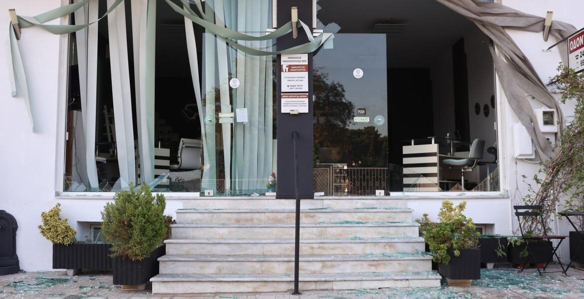 Σπασμένες βιτρίνες καταστημάτων, κατεστραμμένες προσόψεις σπιτιών και ανοιχτές αυλόπορτες