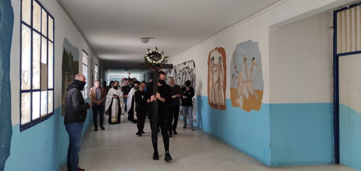 Η Ακολουθία των Παθών στην εκκλησία του Αγίου Ελευθερίου και περιφορά του επιταφίου σε όλες τις πτέρυγες του Καταστήματος Κράτησης και στο Σχολείο, φυσικά.