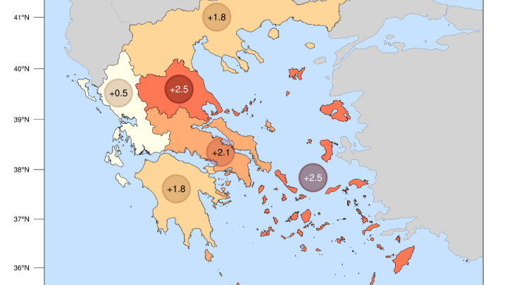 Η μέση τιμή των μέγιστων ημερήσιων θερμοκρασιών τον φετινό Νοέμβριο κυμάνθηκε σε ακραία υψηλά επίπεδα σχεδόν στο σύνολο της χώρας, σε σχέση με τον μέσο όρο της περιόδου 2010-2019, σύμφωνα με το δίκτυο 51 μετεωρολογικών σταθμών του meteo.gr του Εθνικού Αστεροσκοπείου Αθηνών (ΕΑΑ).