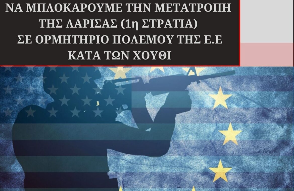 Από την μεριά μας λέμε πως δεν μπορεί να γίνει ανεκτή η μετατροπή της Λάρισας σε κέντρο και πολεμικό ορμητήριο του ιμπεριαλιστικού πολέμου της Ε.Ε και των ΗΠΑ – ΝΑΤΟ απέναντι στο αντάρτικο των Χούθι τον λαό της Παλαιστίνης και της Υεμένης.