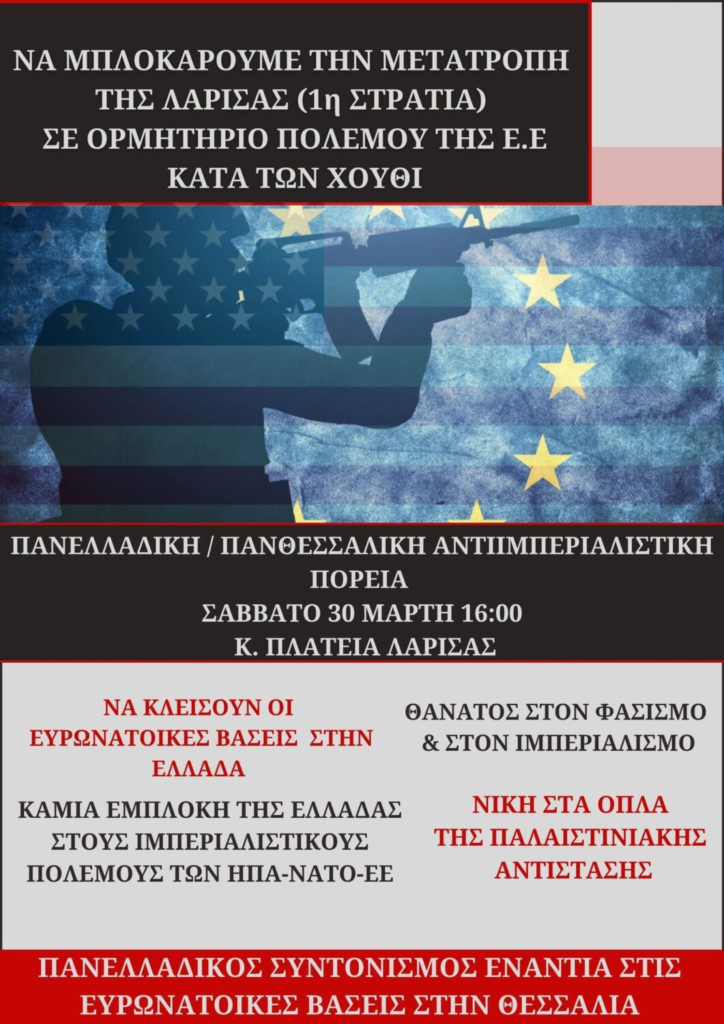 Καλούμε τους φοιτητές, τους εργαζόμενους, τους νέους και την τοπική κοινωνία της πόλης της Λάρισας, ολόκληρης της Θεσσαλίας και της Ελλάδας, Σάββατο 30 Μάρτη στις 16:00 σε πανελλαδικό – πανθεσσαλικό αντιιμπεριαλιστικό συλλαλητήριο, εκφράζοντας την αντίθεση μας στην εμπλοκή της Ελλάδας στους ιμπεριαλιστικούς πολέμους των ΗΠΑ-ΝΑΤΟ- ΕΕ και την μετατροπή της 1ης Στρατιάς σε ορμητήριο πολέμου της ΕΕ.