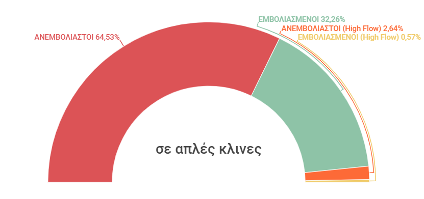 Στις ΜΕΘ βλέπουμε πάνω από 8 στους 10 να είναι ανεμβολιάστοι. Πιο αναλυτικά το 80,28 % είναι ανεμβολίαστοι έναντι μόλις 19,72% που είναι εμβολιασμένοι. Σε απόλυτους αριθμούς στις ΜΕΘ νοσηλεύονται 57 ανεμβολίαστοι και 14 εμβολιασμένοι.
