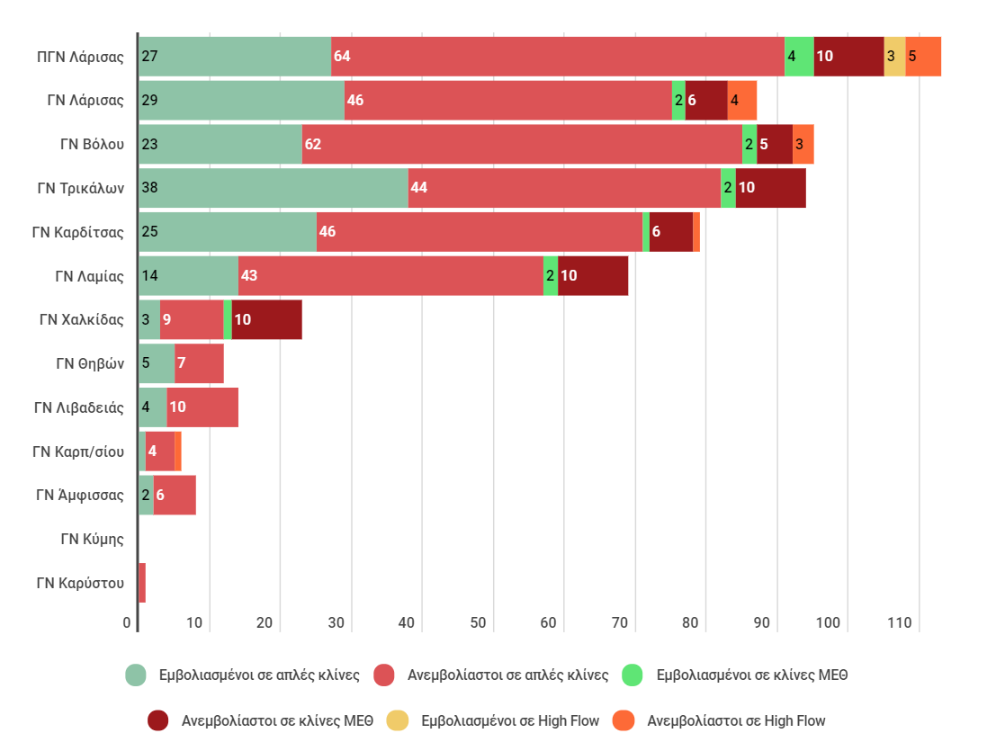 Κοιτώντας τα στοιχεία από την εφημερία της περασμένης Τρίτης βλέπουμε την κατάσταση στα νοσοκομεία όπως αυτή αποτυπώνεται από τους ανθρώπους της 5ης ΥΠΕ. Στις απλές κλίνες οι ανεμβολίαστοι καλύπτουν το 64,53% των κρεβατιών και οι εμβολιασμένοι το 32,26%. Σε αριθμούς, σε απλές κλίνες, 342 είναι ανεμβολίαστοι και 171 εμβολιασμένοι. Το 2,64% των ανεμβολίαστων (14) χρειάζονται high flow έναντι μόλις του 0,57% (3) οι εμβολιασμένοι.