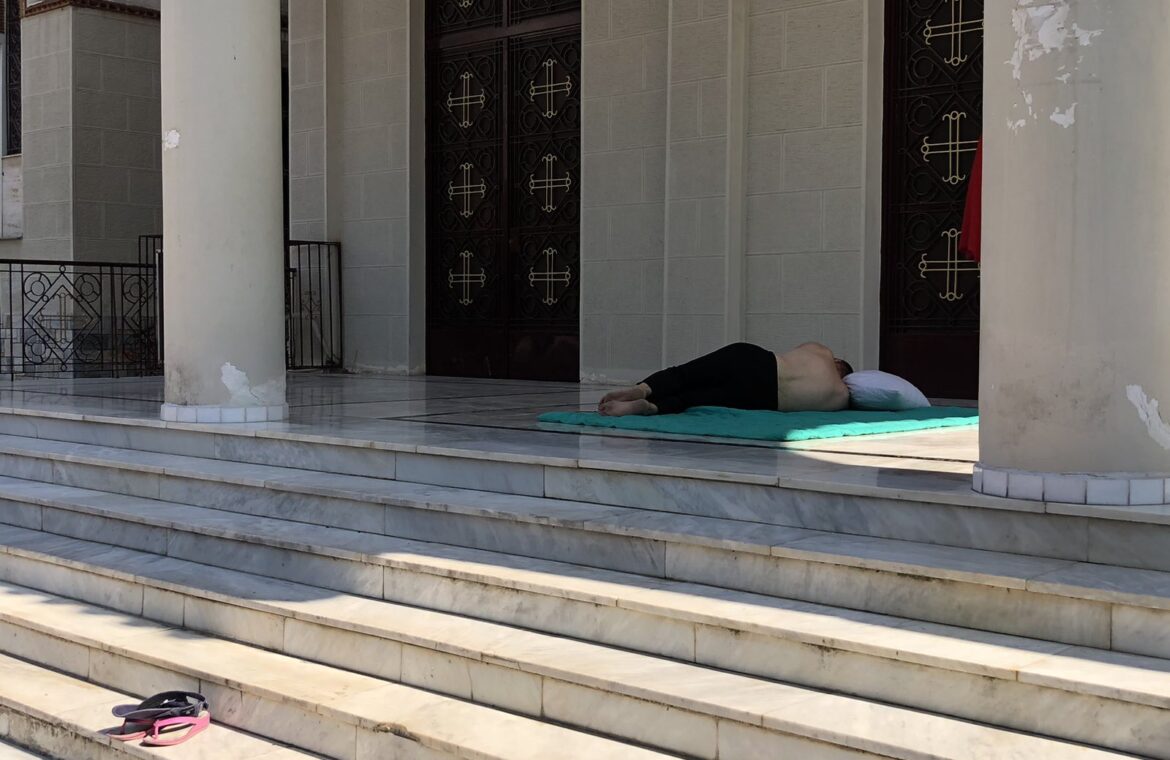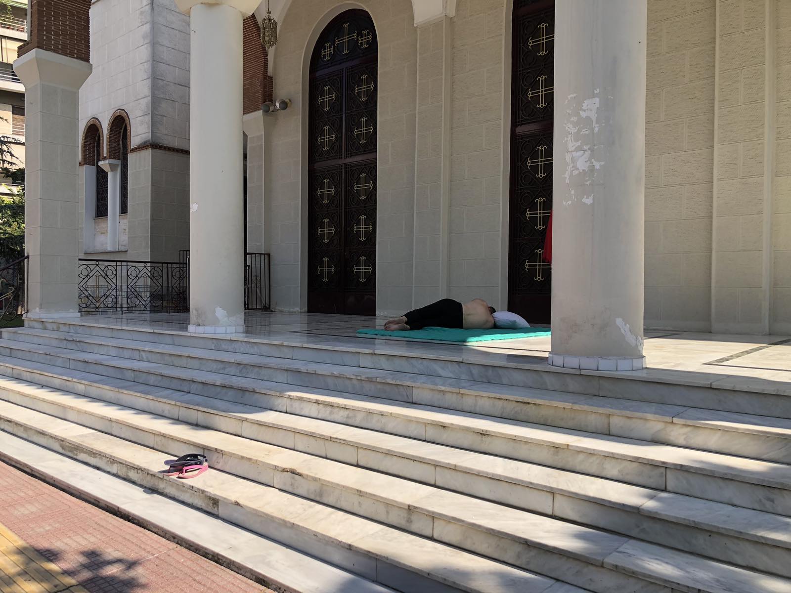 Σαν… κατασκήνωση στην πόλη από ενήλικους δηλαδή και προφανέστατα αυτές οι εικόνες δεν μας τιμούν. Δεν γνωρίζουμε αν πρόκειται για άστεγοους καθώς δεν φέρουν τα χαρακτηριστικά τους, δεν κουβαλούν την πραμάτεια τους, παραμόνο τα… κομφόρ για έναν γρήγορο μεσημεριανό ύπνο στον (όσο γίνεται) δροσερό μαρμάρινο χώρο εξωτερικά του Ιερού Ναού. Όπως να να’ χει οι ιθύνοντες θα πρέπει να επιληφθούν του θέματος το συντομότερο.