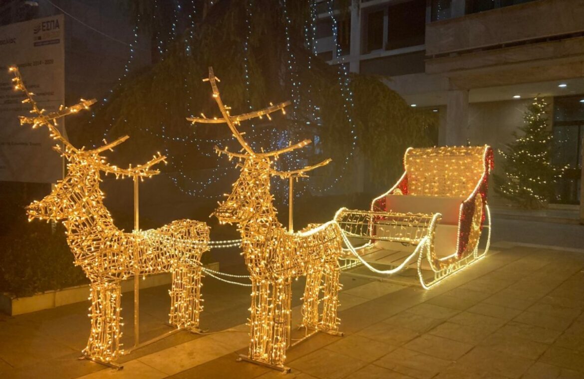Με ένα φωτισμένο έλκηθρο, μαγνήτης για τους μικρούς και μεγάλους, αλλά και μια φωτεινή σφαίρα γεμάτη αστέρια στολίστηκε ο χώρος μπροστά από την Περιφέρεια Θεσσαλίας, Περιφερειακή Ενότητα Λάρισας.