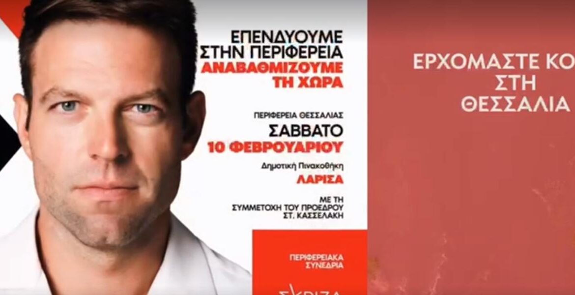 «Η περιφέρειά μας στο επίκεντρο. Ερχόμαστε κοντά στη Θεσσαλία που δοκιμάστηκε και δοκιμάζεται σκληρά από τις πρόσφατες καταστροφές. Στο κέντρο της προσοχής η κοινωνία. Στην εποχή της ακρίβειας, των μεγάλων προβλημάτων των αγροτών, της αντιπλημμυρικής θωράκισης, της υποβάθμισης της υγείας, της ιδιωτικοποίησης της παιδείας. Πρέπει να διεκδικήσουμε τη ζωή μας. Επενδύουμε στην περιφέρεια, αναβαθμίζουμε τη χώρα» επισημαίνεται στο σχετικό σποτ για το συνέδριο του ΣΥΡΙΖΑ-Προοδευτική Συμμαχία.