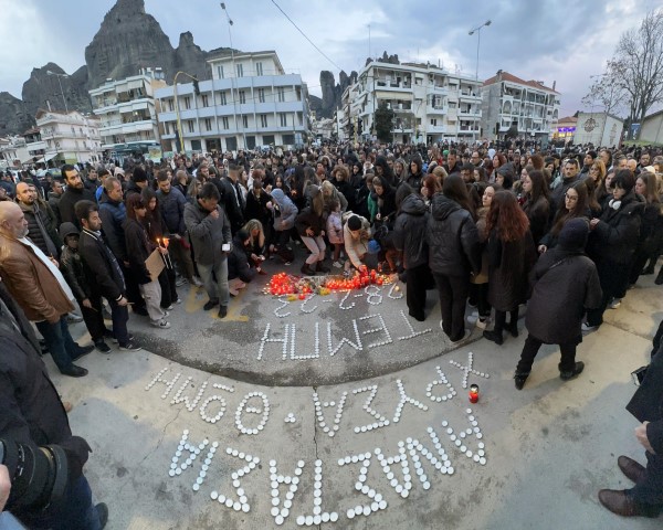 Συγκεντρώθηκαν στην κεντρική πλατεία της Καλαμπάκας, “έγραψαν” τα ονόματα των κοριτσιών στα πλακάκια και άναψα κεράκια. Στη συνέχεια και όπως κατέγραψε το trikalavoice.gr ξεκίνησαν με κεράκια στα χέρια, σιωπηλοί σε πορεία προς τον σταθμό του ΟΣΕ και άφησαν μαύρα μπαλόνια να φύγουν στον ουρανό. Η Καλαμπάκα πενθεί και πονάει.