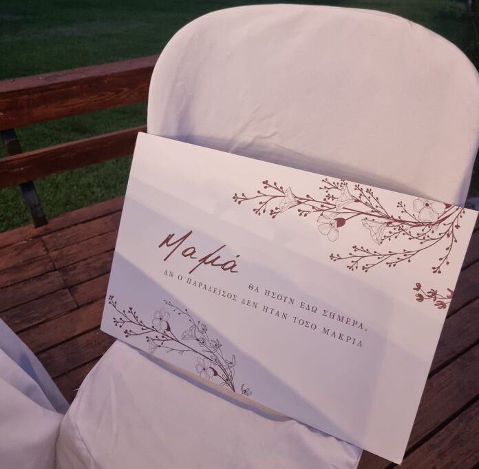 Σε αυτή την καρέκλα ιδανικά θα καθόταν η μητέρα της νύφης. Παρόλη την απουσία της, το ζευγάρι σε ένδειξη τιμής, άφησε στο νυφικό τραπέζι μια καρέκλα κενή με αυτή την κάρτα πάνω.