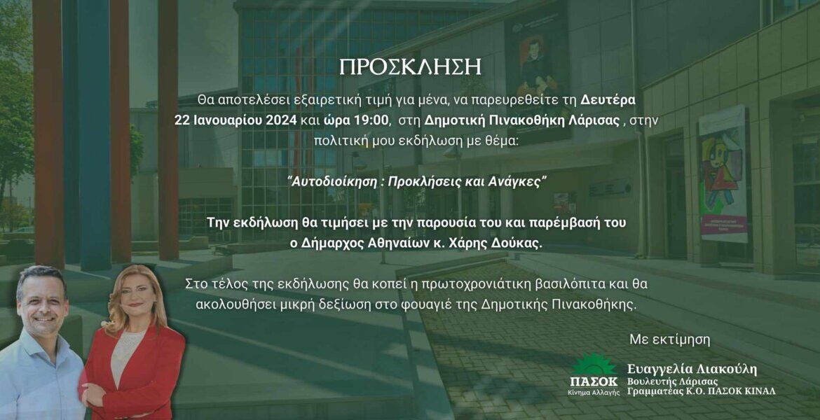 Με το «παρών» του, λοιπόν, την Δευτέρα 22/01 ώρα 19.00 το απόγευμα, στην πολιτική εκδήλωση και την κοπή της πρωτοχρονιάτικης πίτας της Βουλευτή, στη Δημοτική Πινακοθήκη Λάρισας, γίνεται ακόμη πιο σαφής η αλλαγή των πολιτικών συσχετισμών, όπως και των σχετικών κομματικών δυναμικών, που σηματοδότησαν οι πρόσφατες αυτοδιοικητικές εκλογές, μαζί με τις εμφατικές νίκες των κ.κ. Κουρέτα στη Θεσσαλία και Αγγελούδη στη Θεσσαλονίκη και πολλών ακόμη αυτοδιοικητικών σε όλη τη χώρα.
