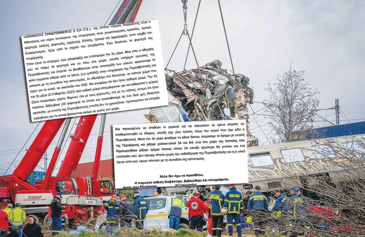 Και συνέχισε: «Οταν έγινε το ατύχημα, εγώ απουσίαζα και επέστρεψα τη δεύτερη μέρα. Μου είπε ο αδερφός μου να πάρω τα φορτηγά και να πάω στον χώρο, επειδή υπήρχαν εργασίες της Πυροσβεστικής και έπρεπε να βοηθήσουμε στην αποκομιδή των υλικών. Φορτώναμε τα ψιλά κομμάτια σίδερα από το τρένο, ό,τι εμπόδιζε στην επιχείρηση της Πυροσβεστικής, και μάλιστα με τη συνοδεία της Αστυνομίας τα αδειάζαμε στο Κουλούρι, σε κάποιο χώρο που είχαν για τα υλικά, σε οικόπεδο του ΟΣΕ. Να αναφέρω ότι δεν ήταν καθαρό χώμα».